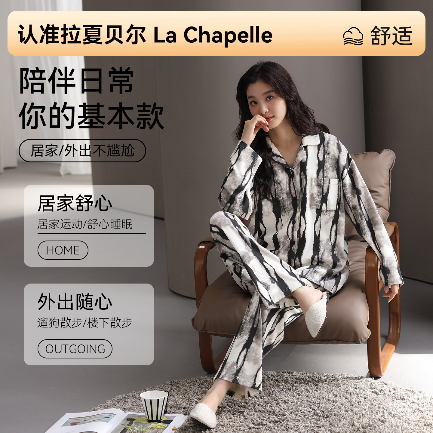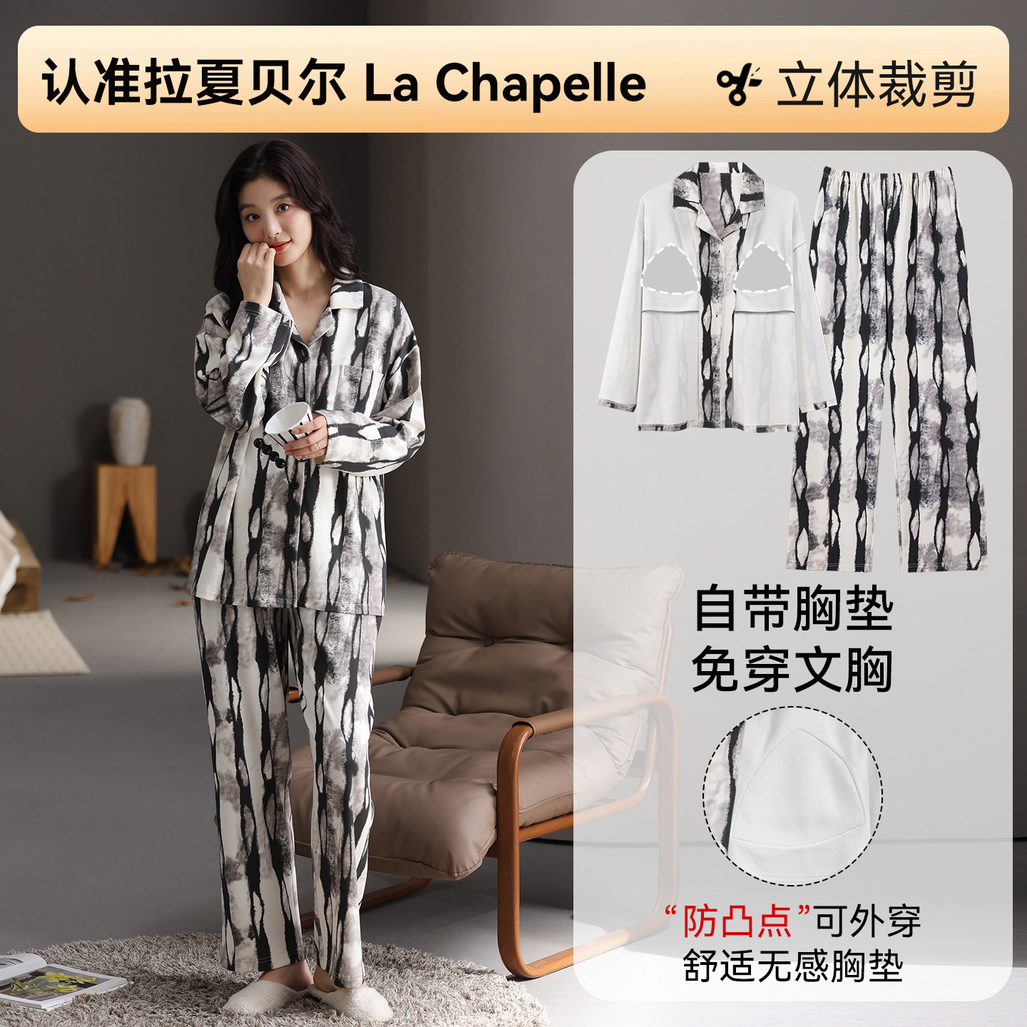 拉夏贝尔纯棉睡衣女款高级感带胸垫款2026新款春季女士家居服套装