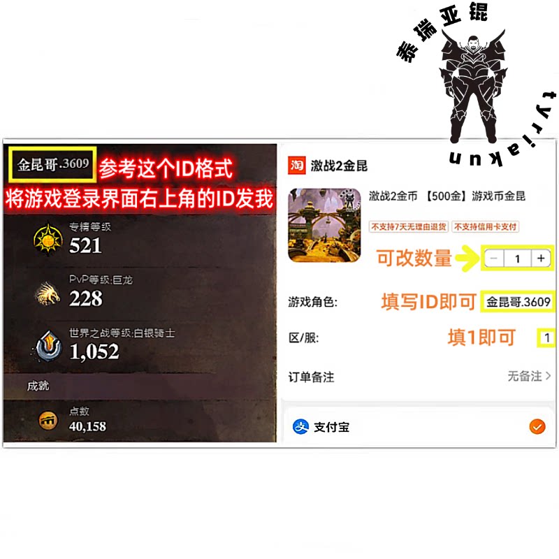 激战2金币 【500金】游戏币金昆国服全平台全区全服发货