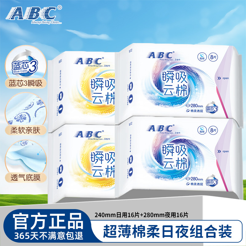 ABC卫生巾240日用夜用组合装瞬吸云棉棉柔姨妈巾官方旗舰护翼超薄
