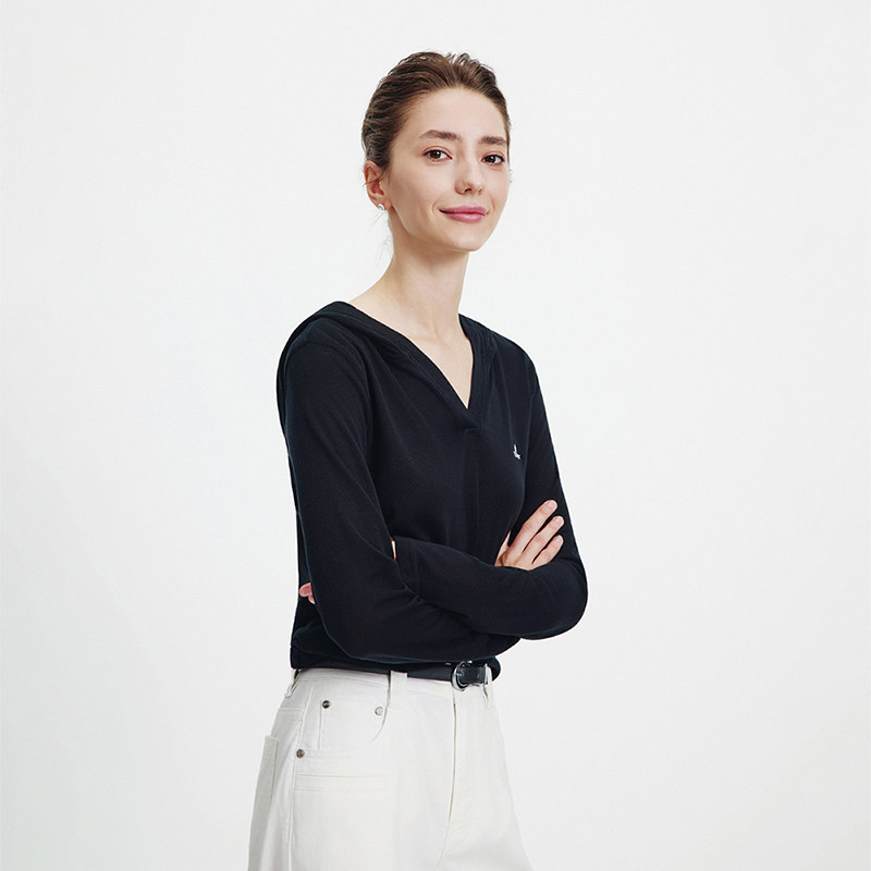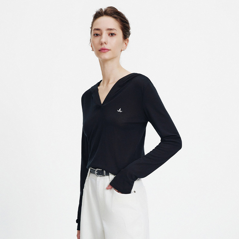 Navigare意大利小帆船黑色连帽长袖T恤女2026春夏V领高弹套头衫