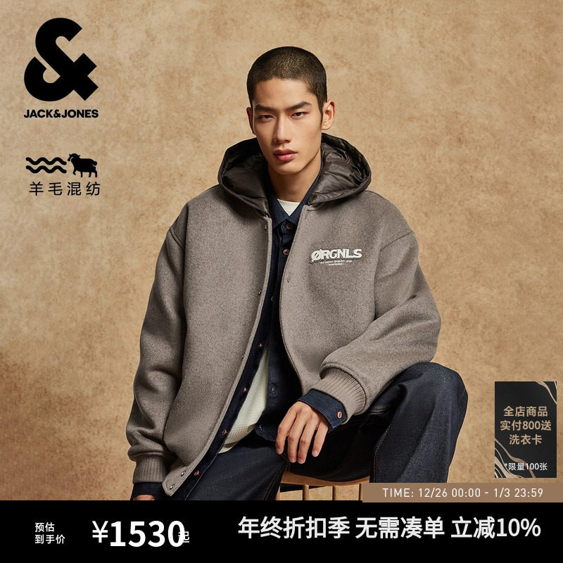 杰克琼斯男装冬季毛呢大衣夹棉可拆卸连帽棒球领含羊毛通勤风外套