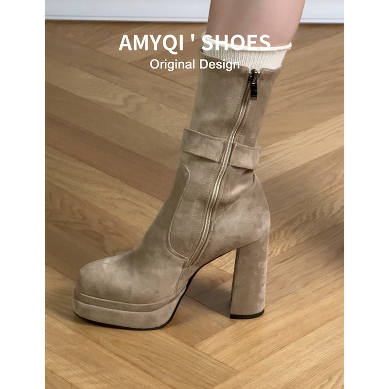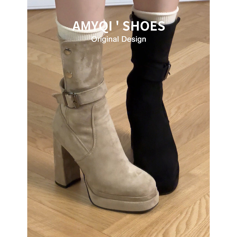 韩系显瘦防水台厚底高跟短靴女2025新款秋冬加绒粗跟弹力瘦瘦靴子