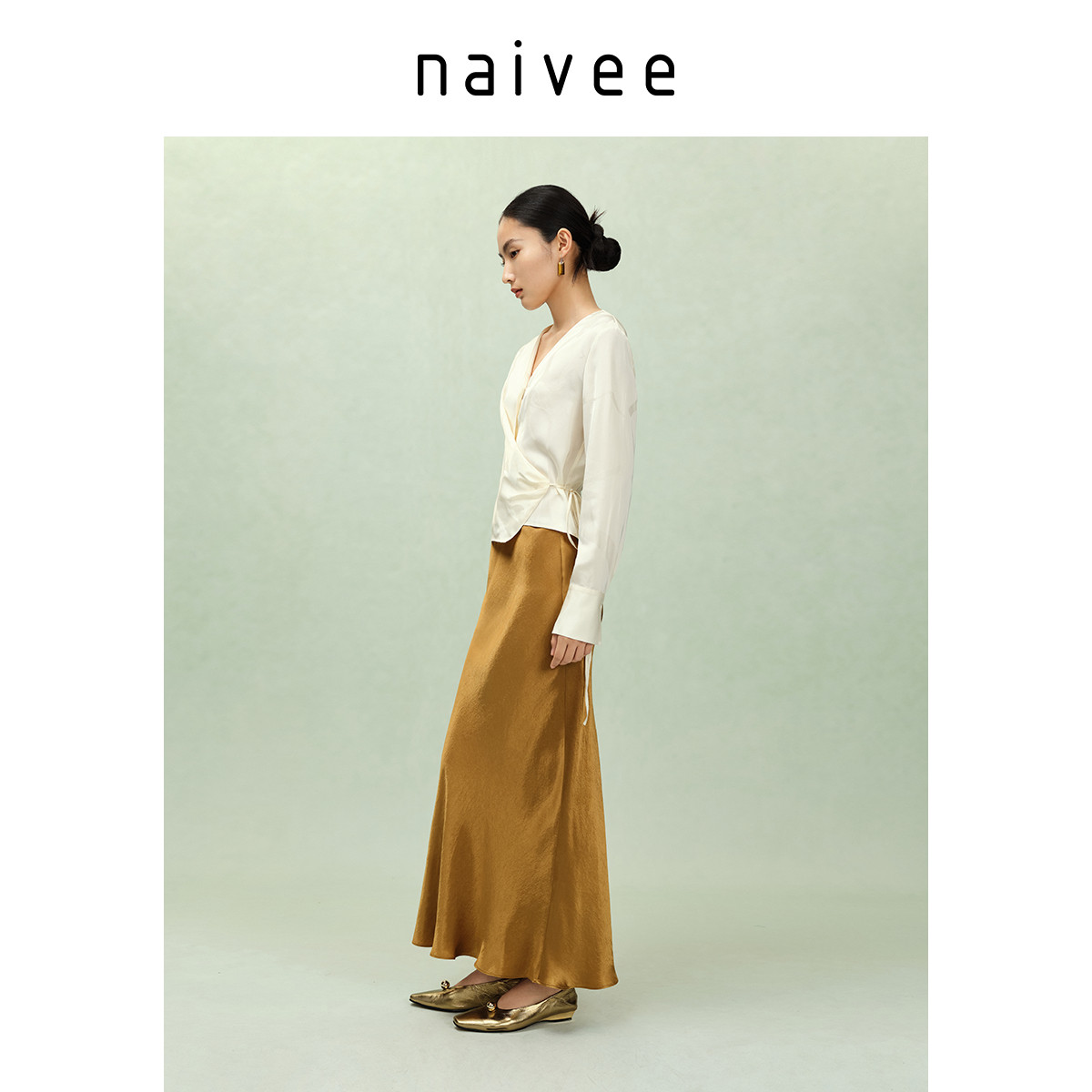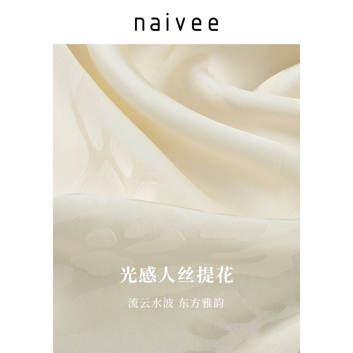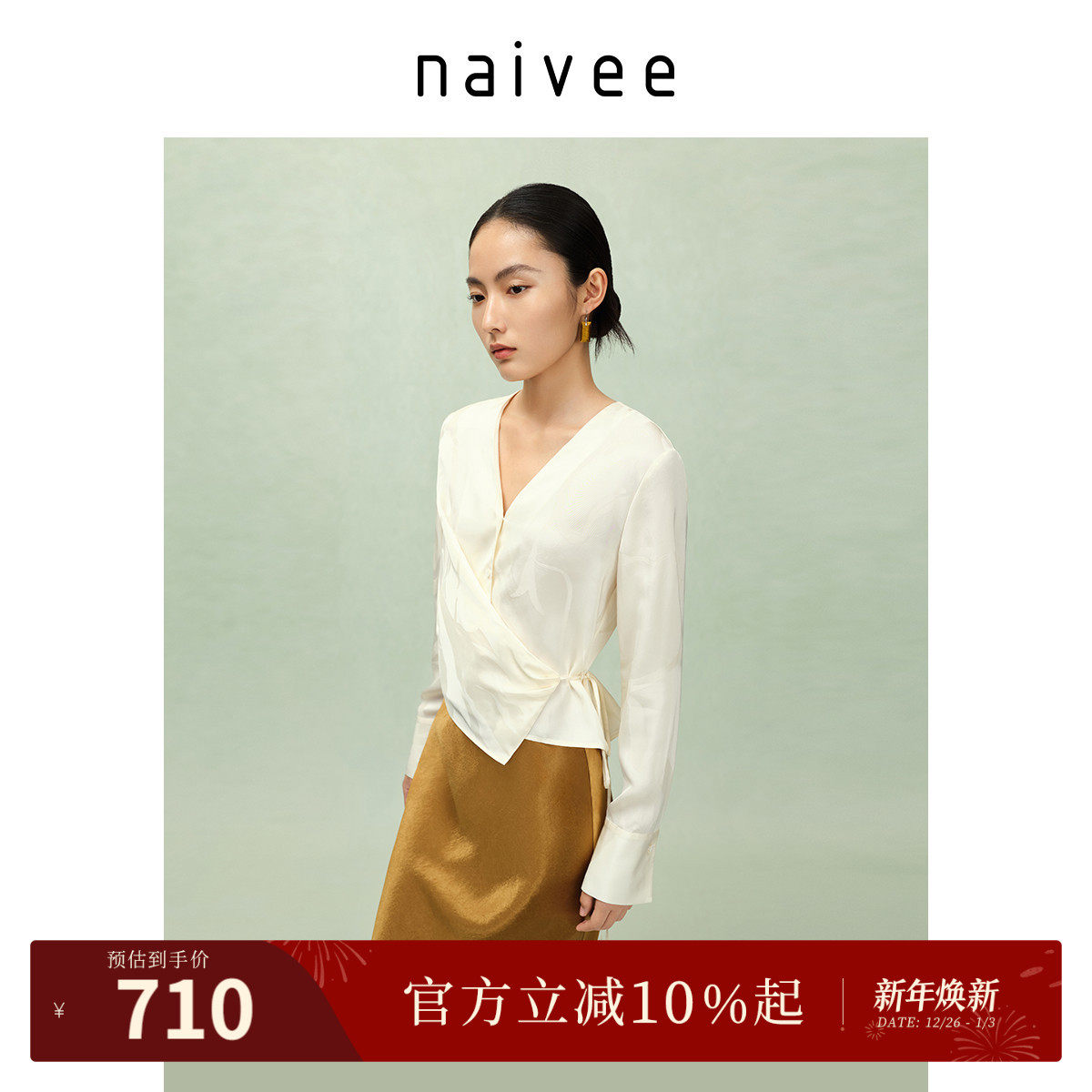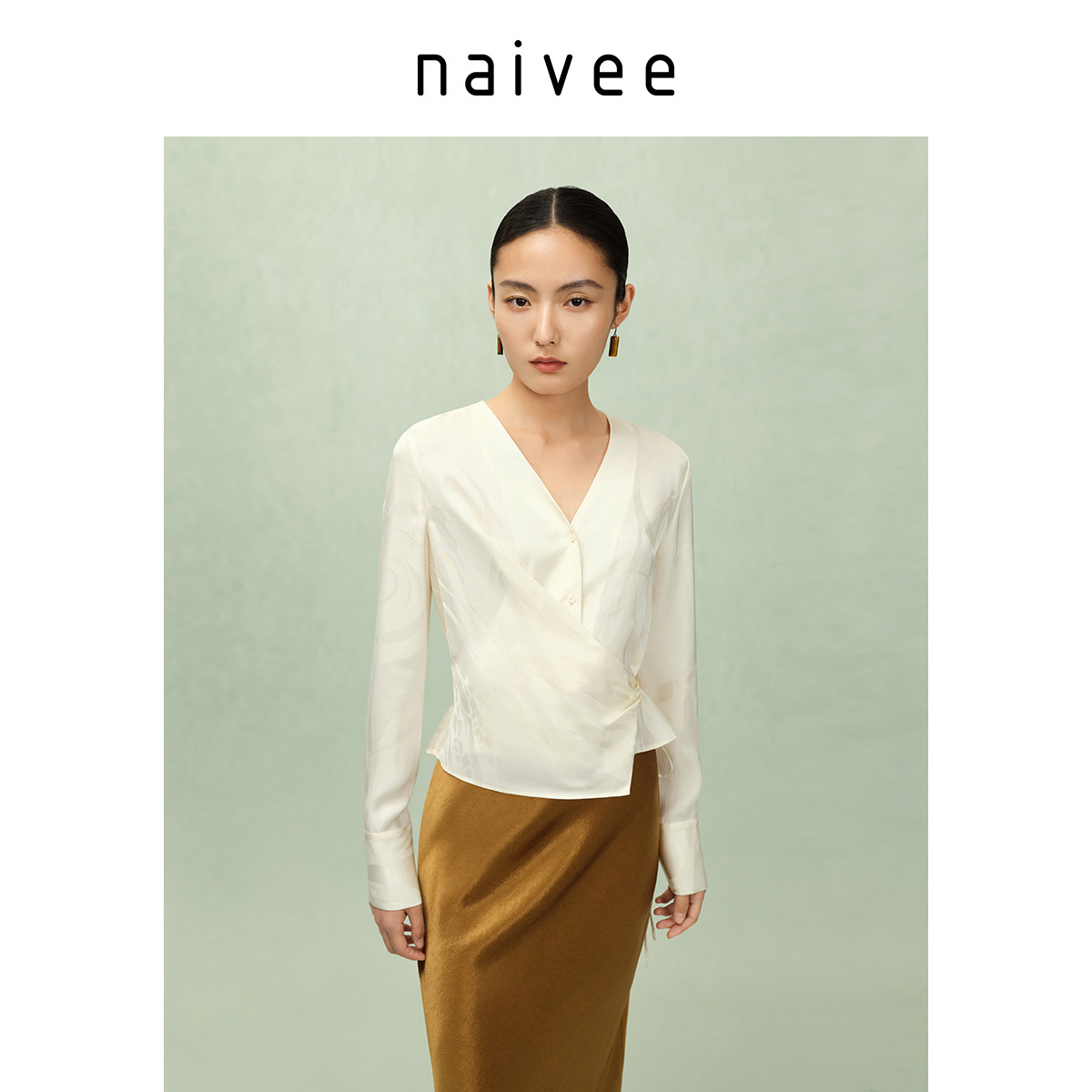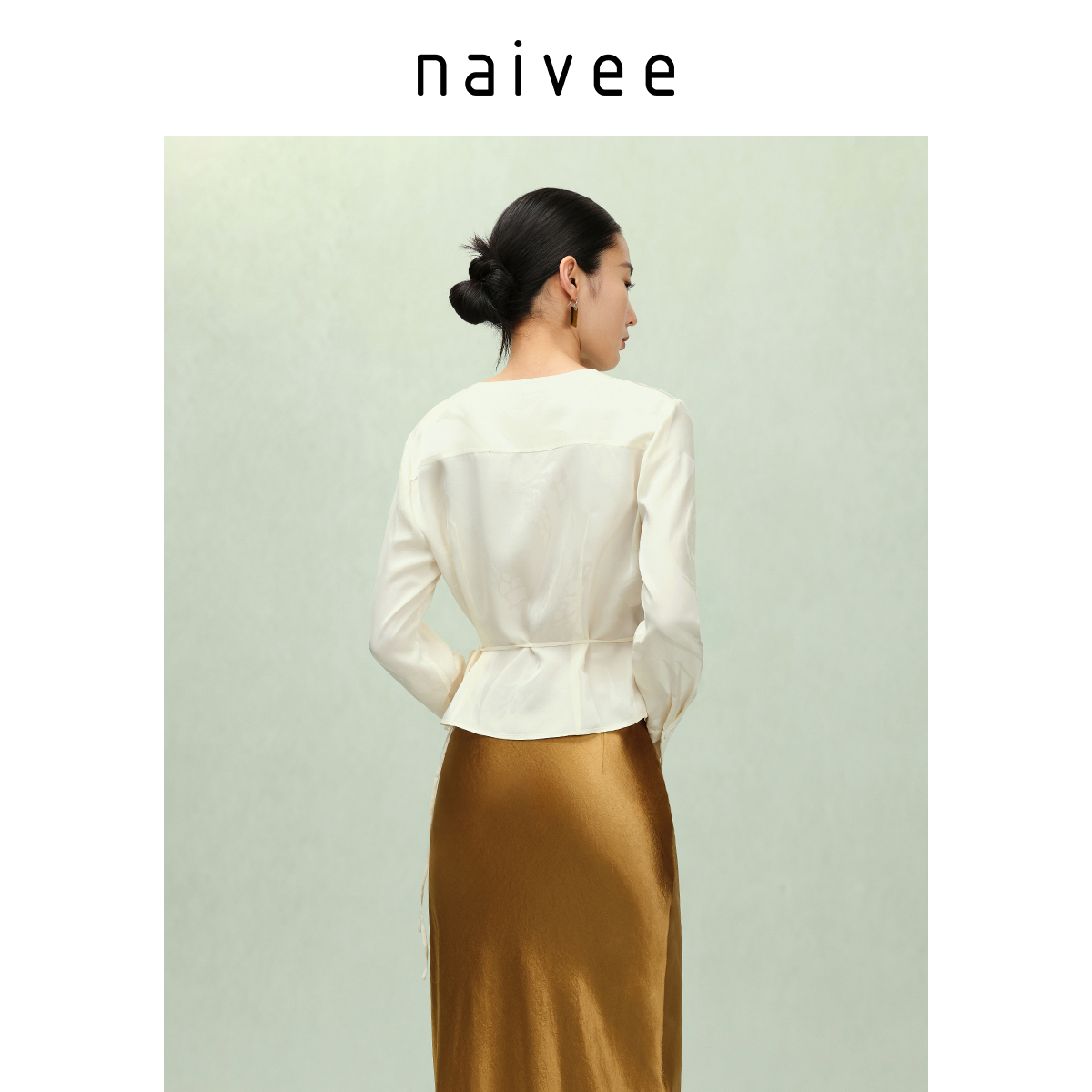 商场同款naivee纳薇新中式长袖衬衫系带上衣25秋新款光感人丝提花