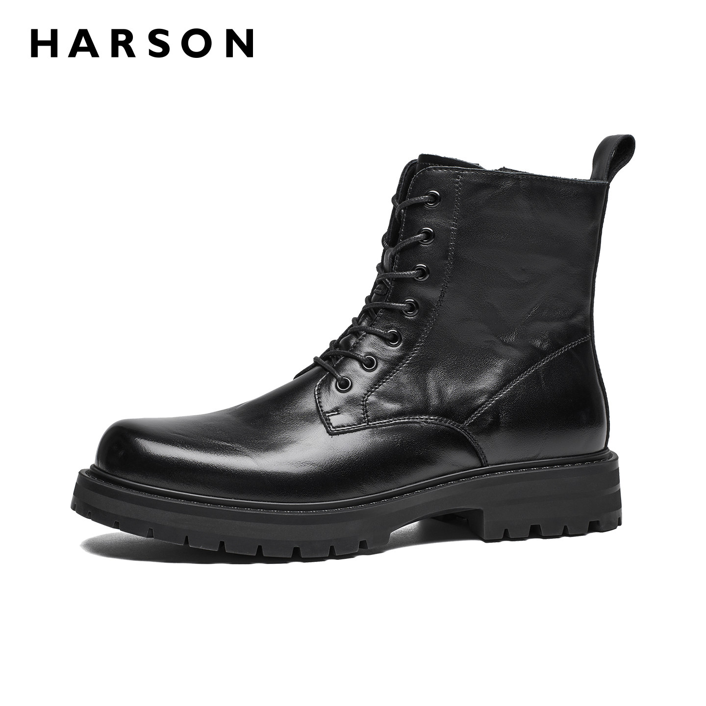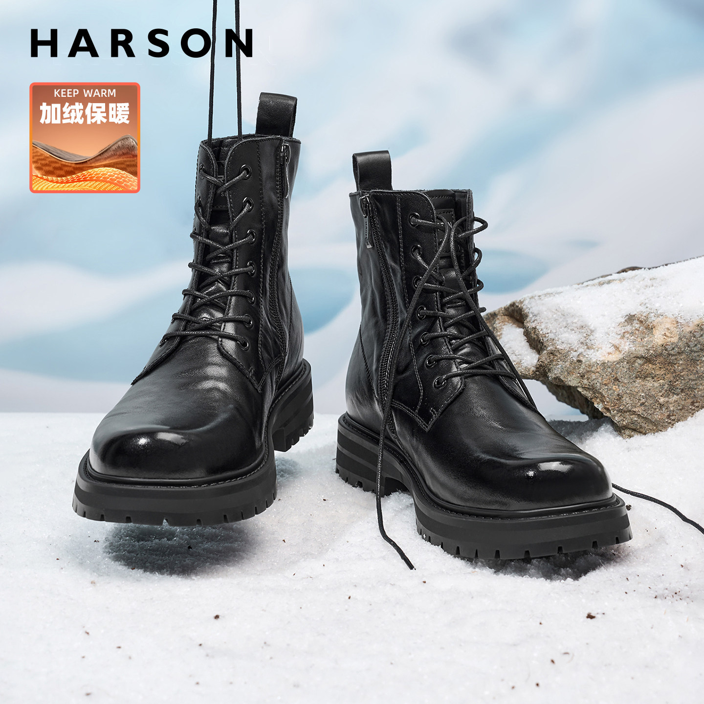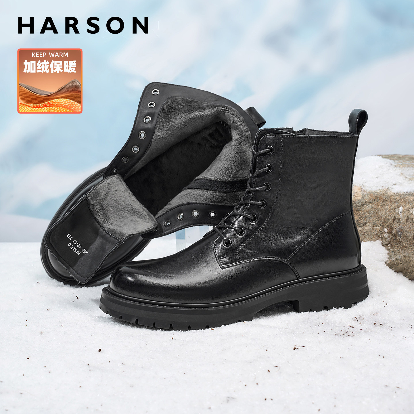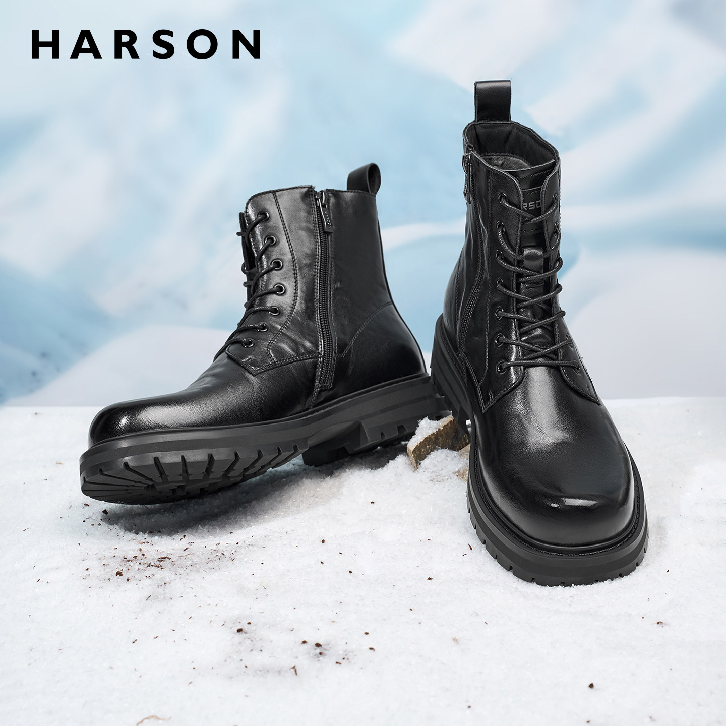哈森男鞋厚底男士冬季马丁靴加绒加厚中帮靴子新款户外真皮短靴男