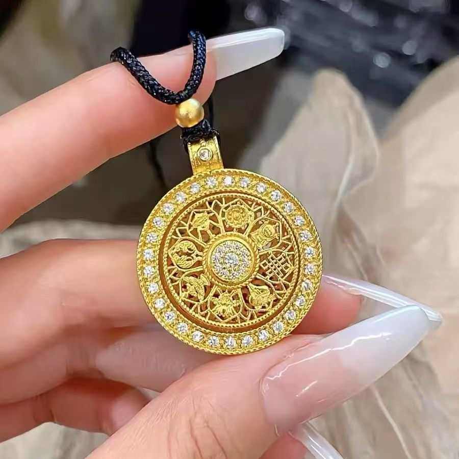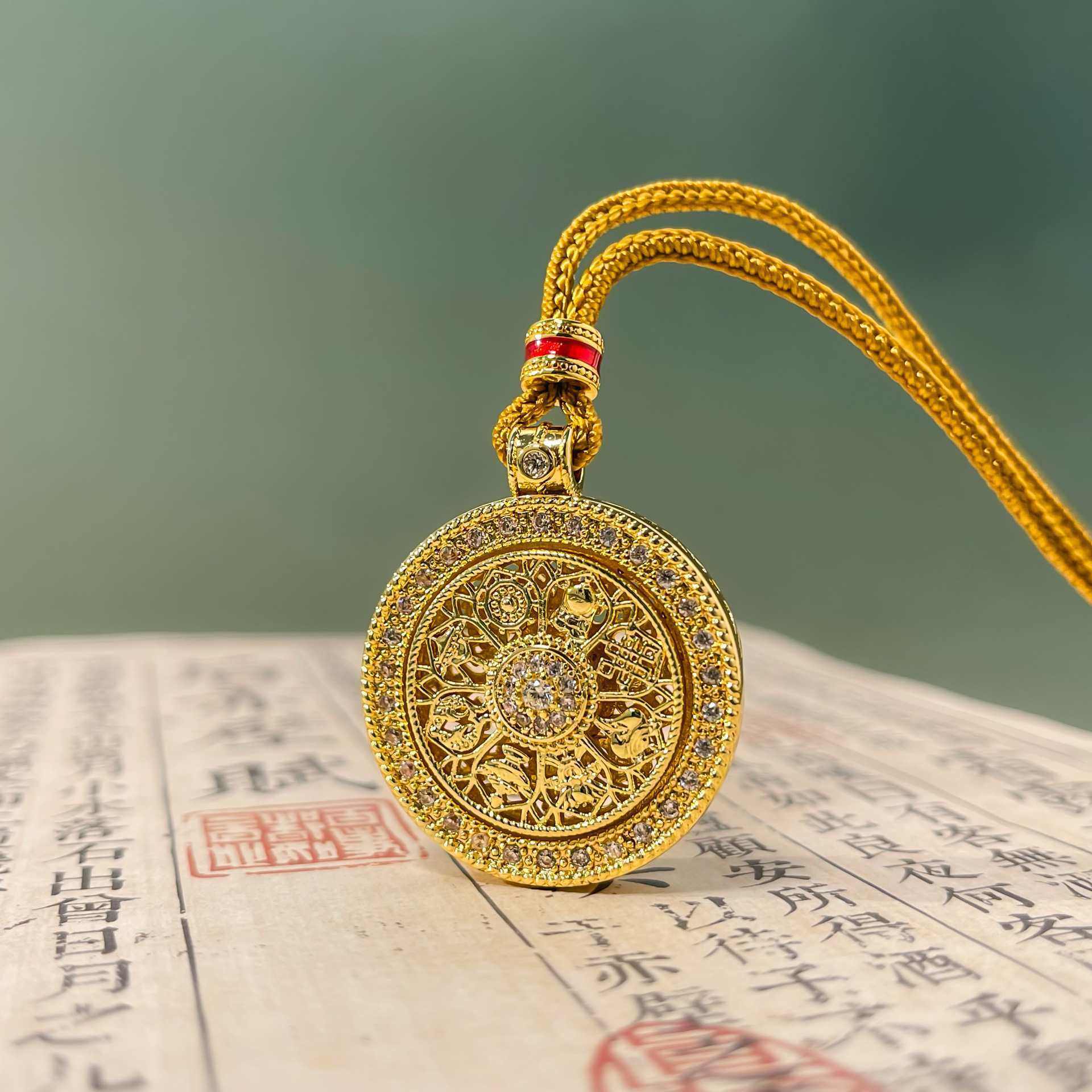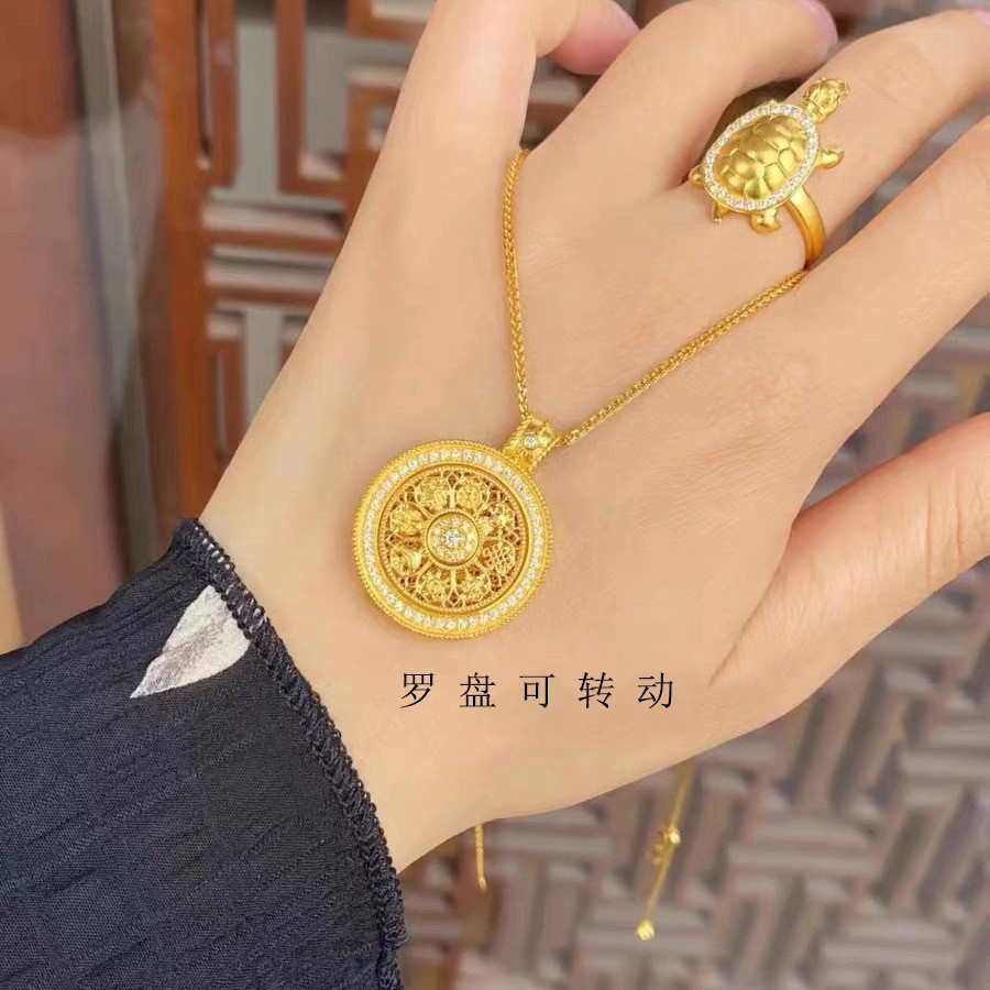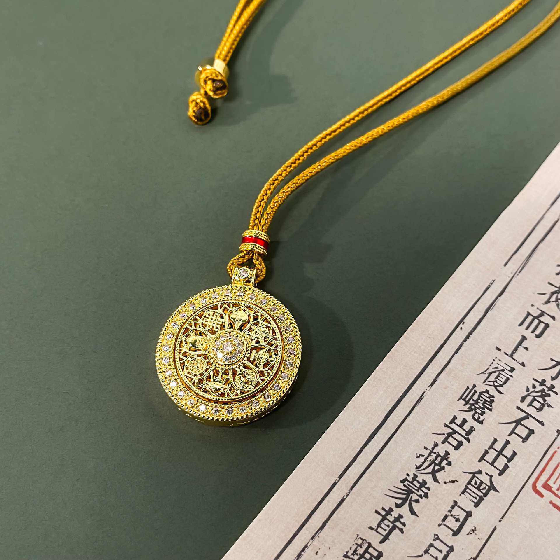 新中式圆形镶钻八宝罗盘镂空可转动项链复古金色双面花纹雕花绳子