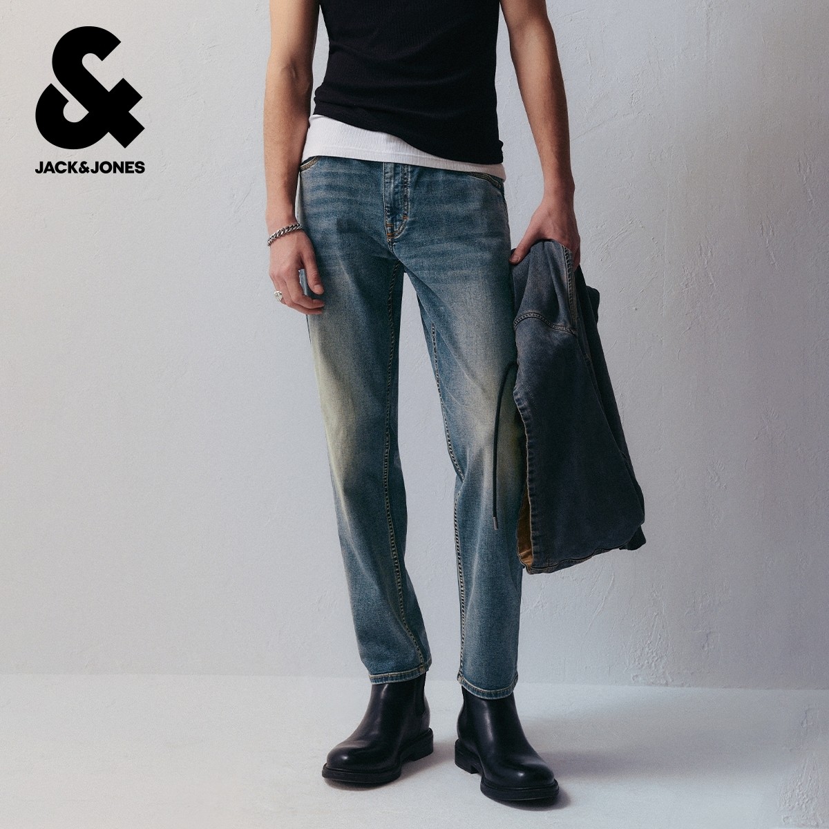 王安宇同款森马牛仔裤男做旧复古阔感弯刀裤宽松弧形裤2025冬新款