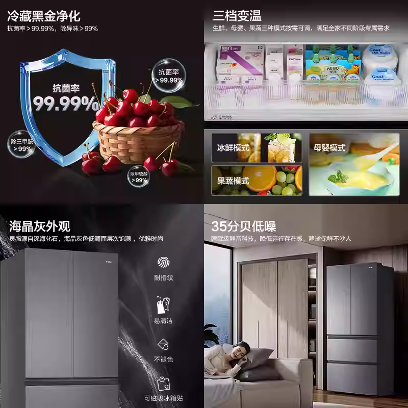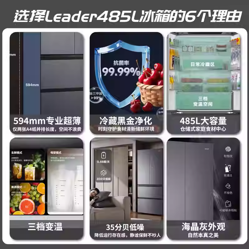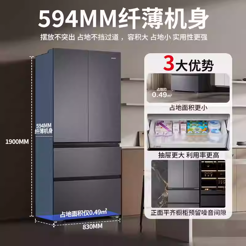 海尔法式家用冰箱485L容量超薄机身594mm一级能效双变频风冷无霜