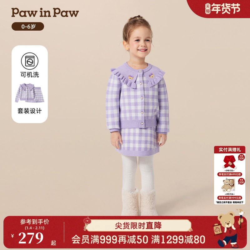 PawinPaw卡通小熊童装25秋冬新款女宝宝大翻领毛织套装小香风甜美