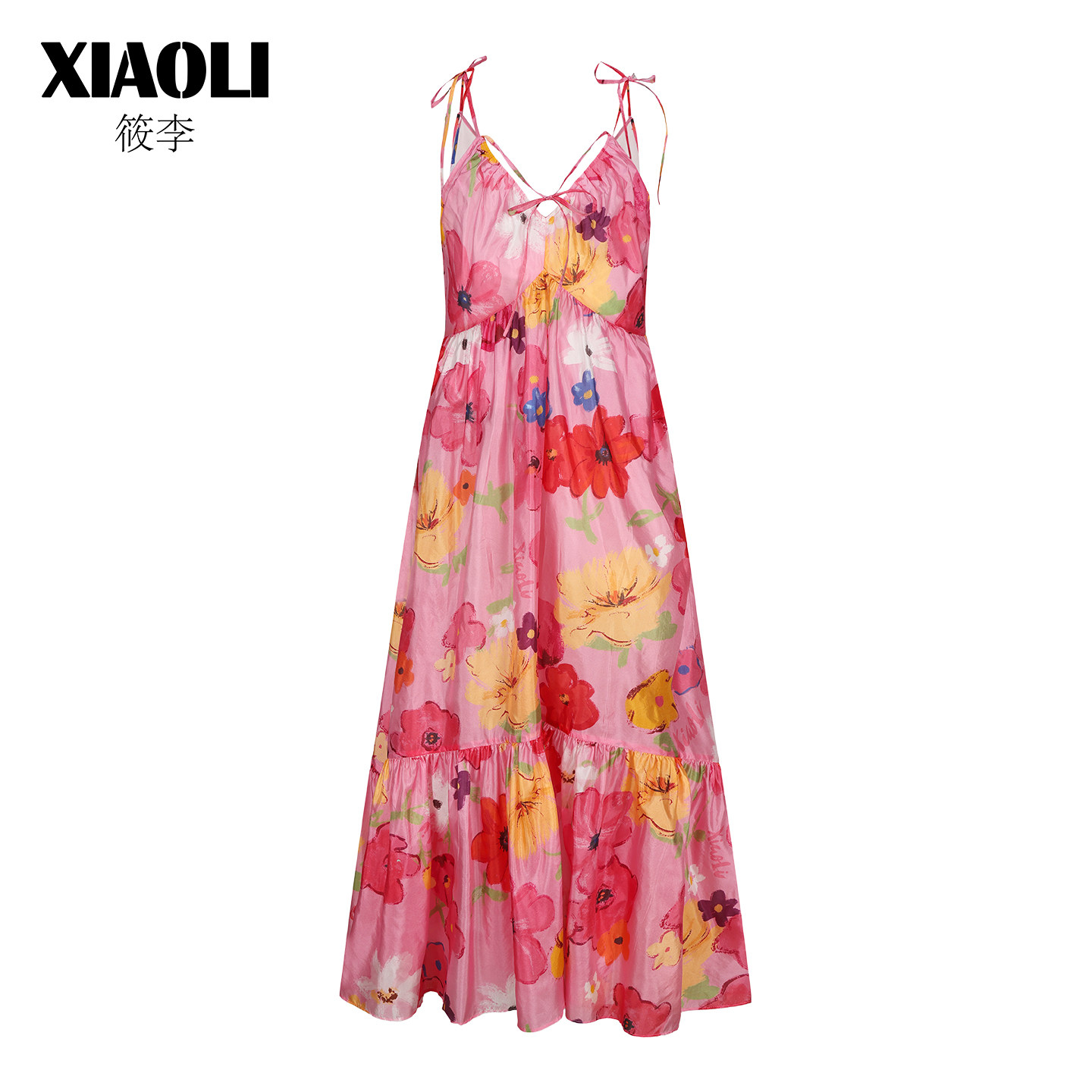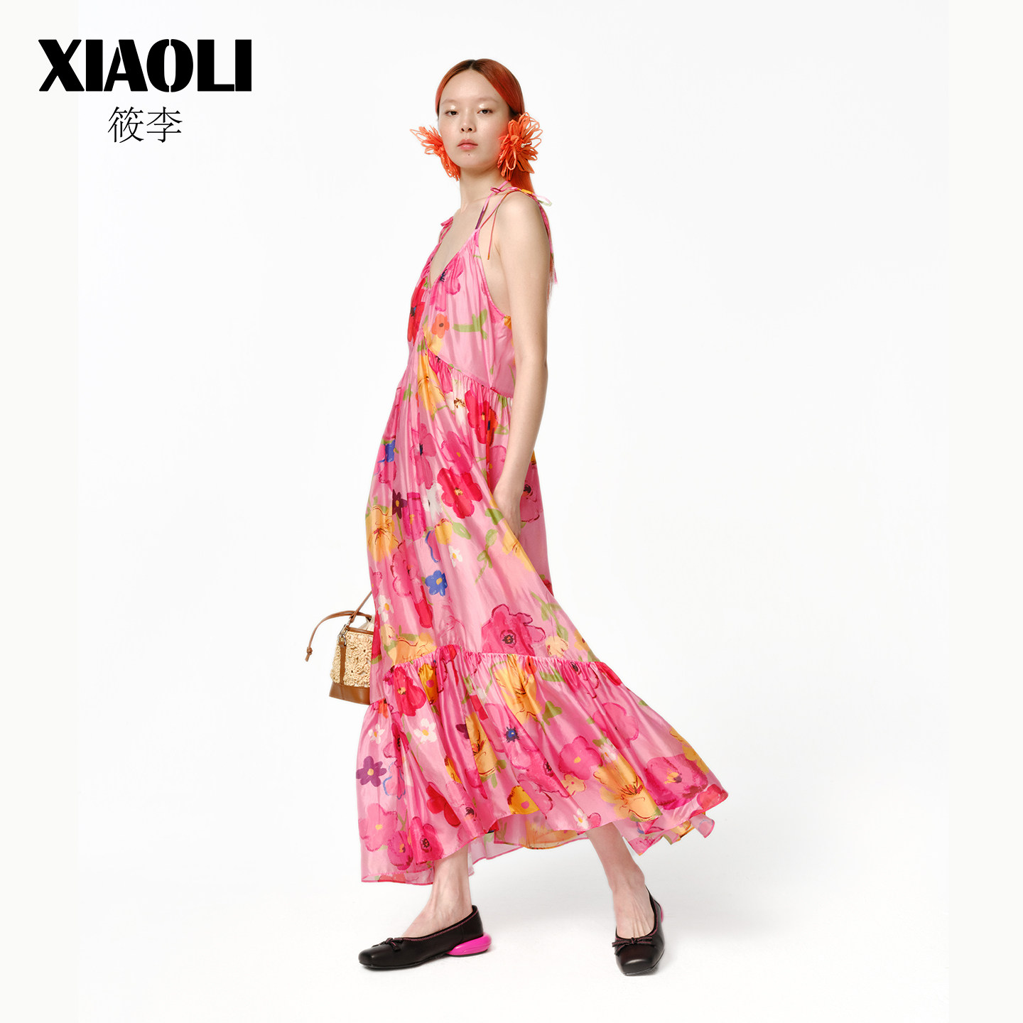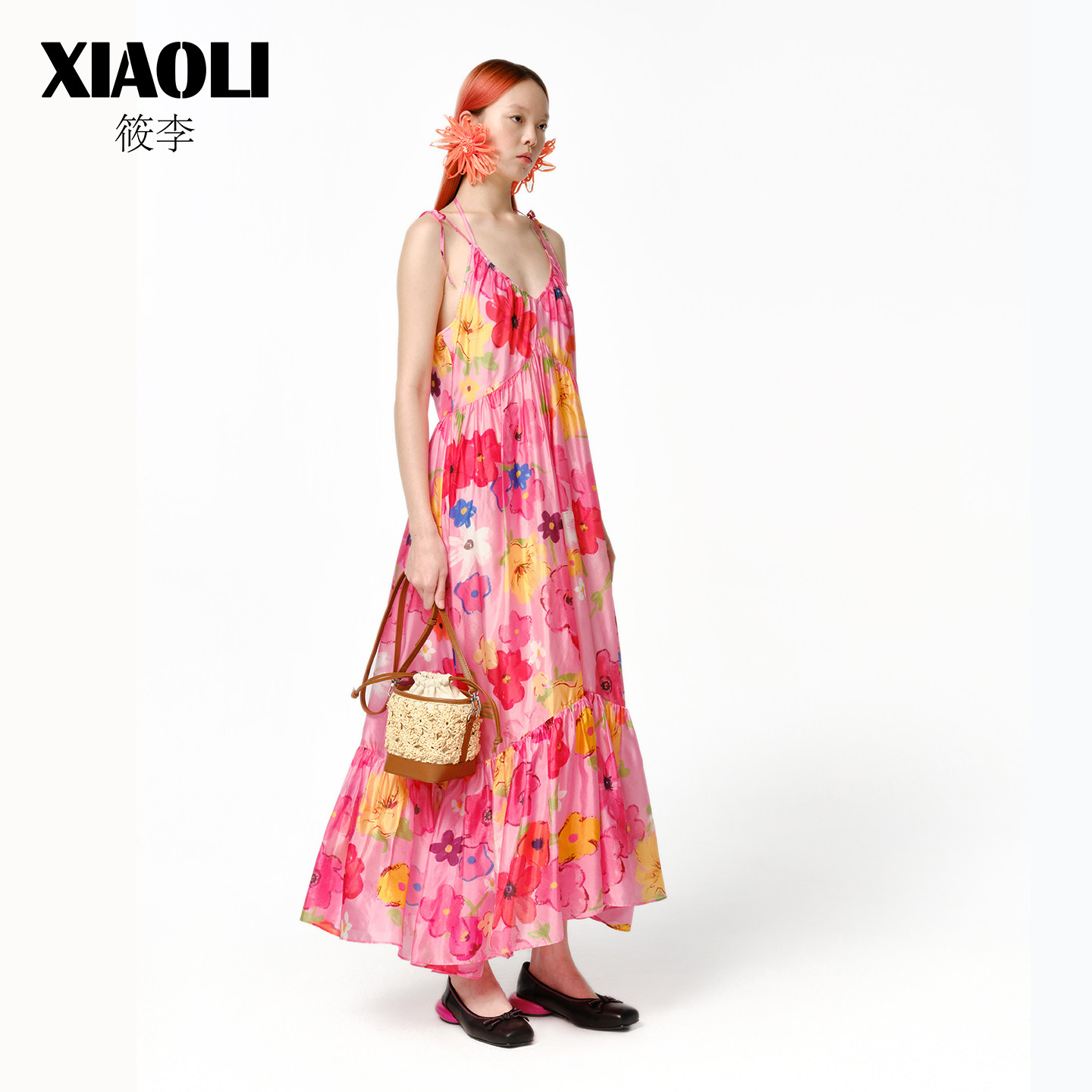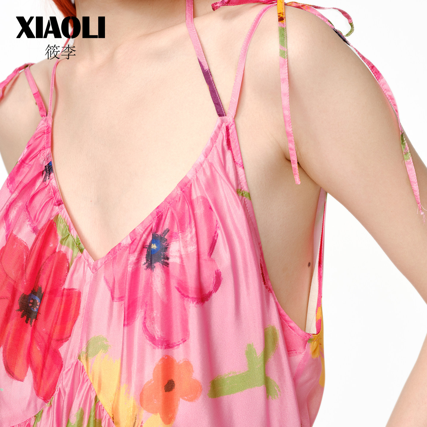 【XIAOLI筱李】粉色印花真丝桑蚕丝挂脖吊带连衣裙度假裙