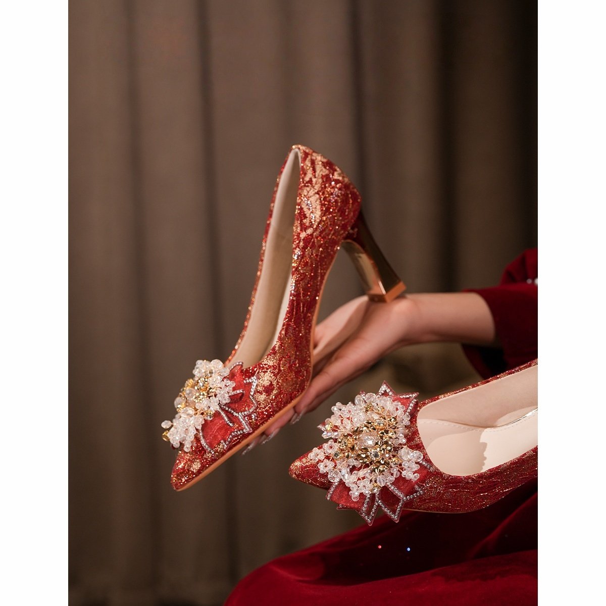 婚鞋女2024年新款主婚纱新娘鞋亮片香槟色水晶鞋尖头细跟高跟鞋女