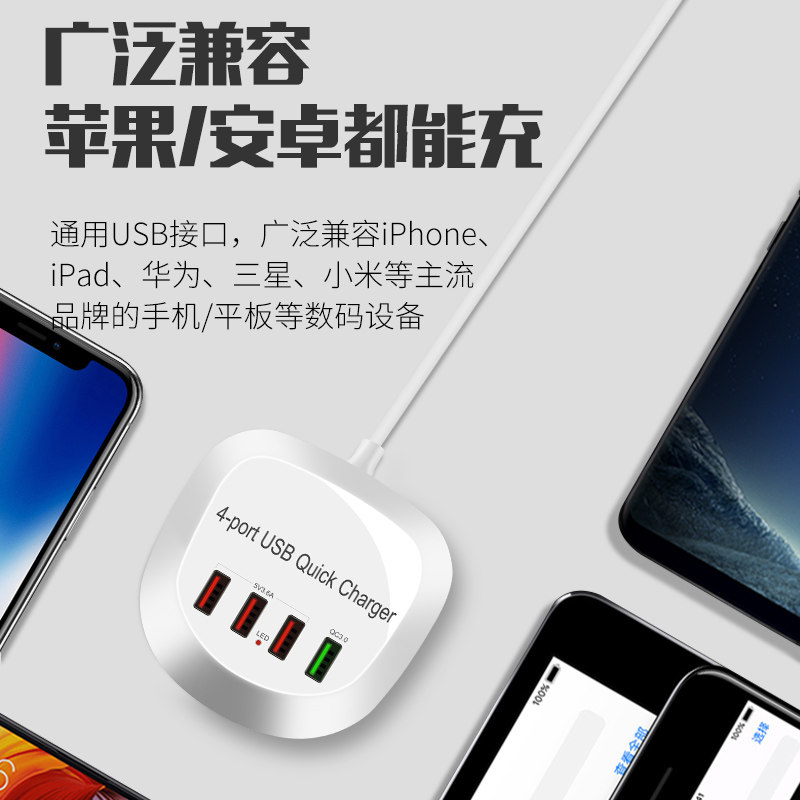 QC3.0快充插头手机充电器一拖四多口USB插座安卓苹果通用智能排插