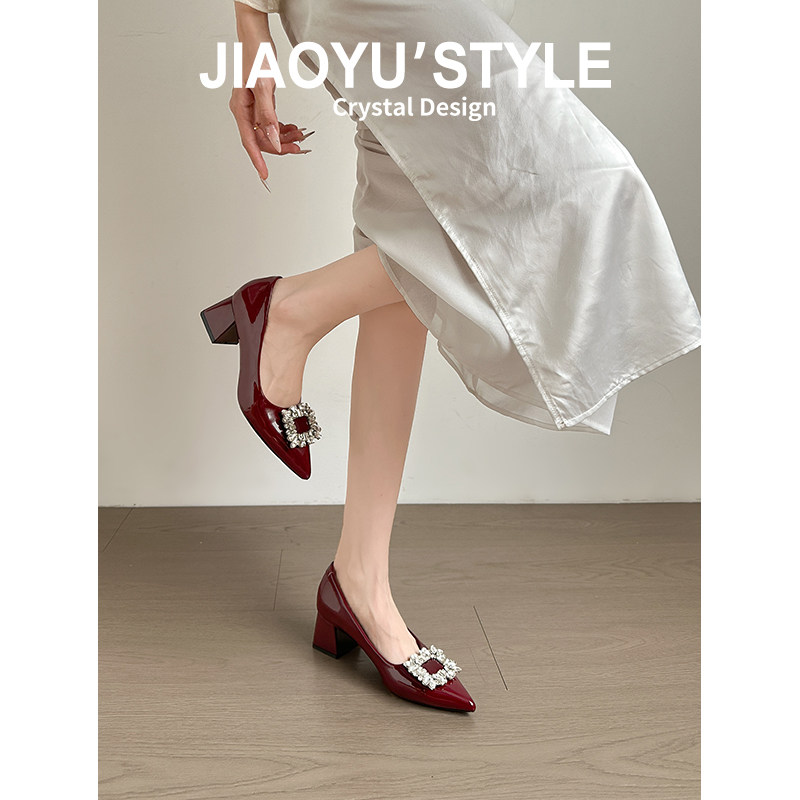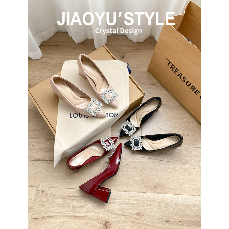 真皮~骄屿 水钻粗跟高跟鞋女2026新款春秋玛丽珍绝美晚晚尖头单鞋