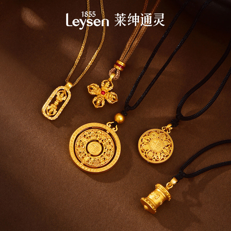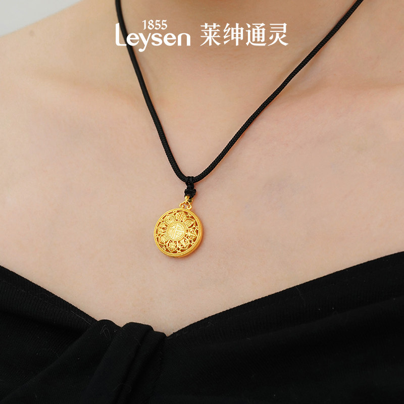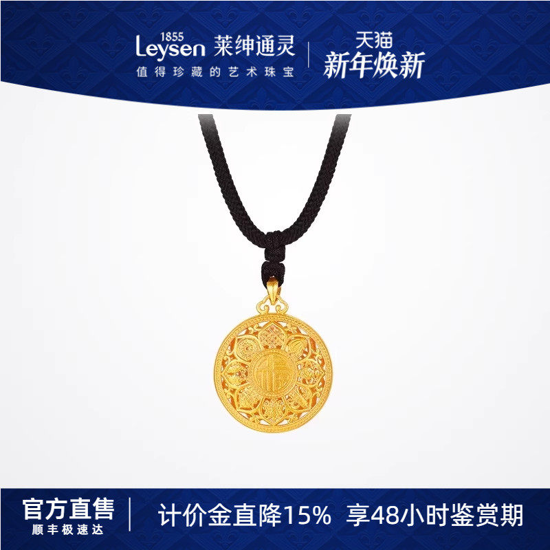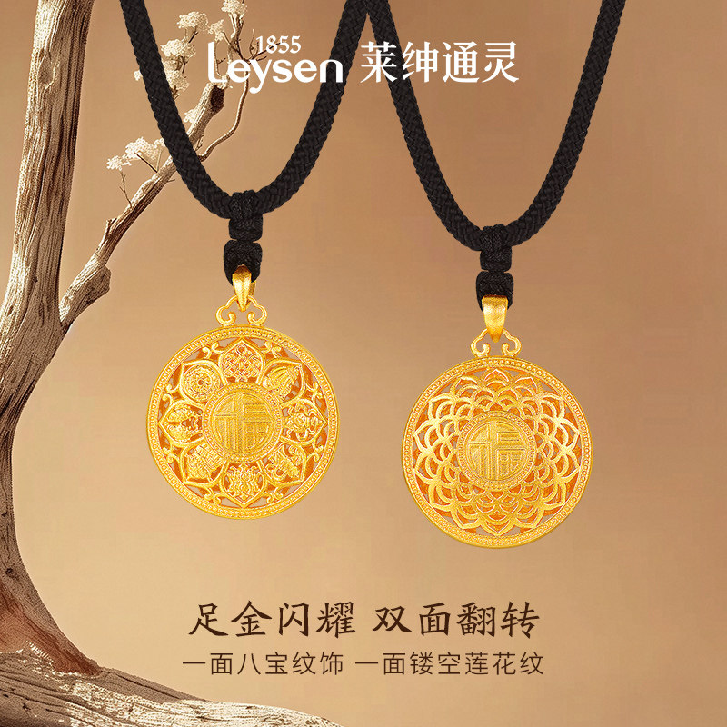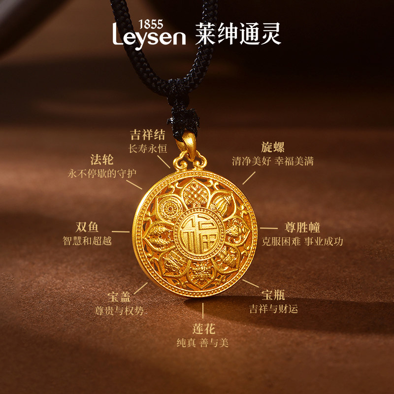 【计价金】莱绅通灵梵光系列 莲花 八宝罗盘足金黄金吊坠 黑绳