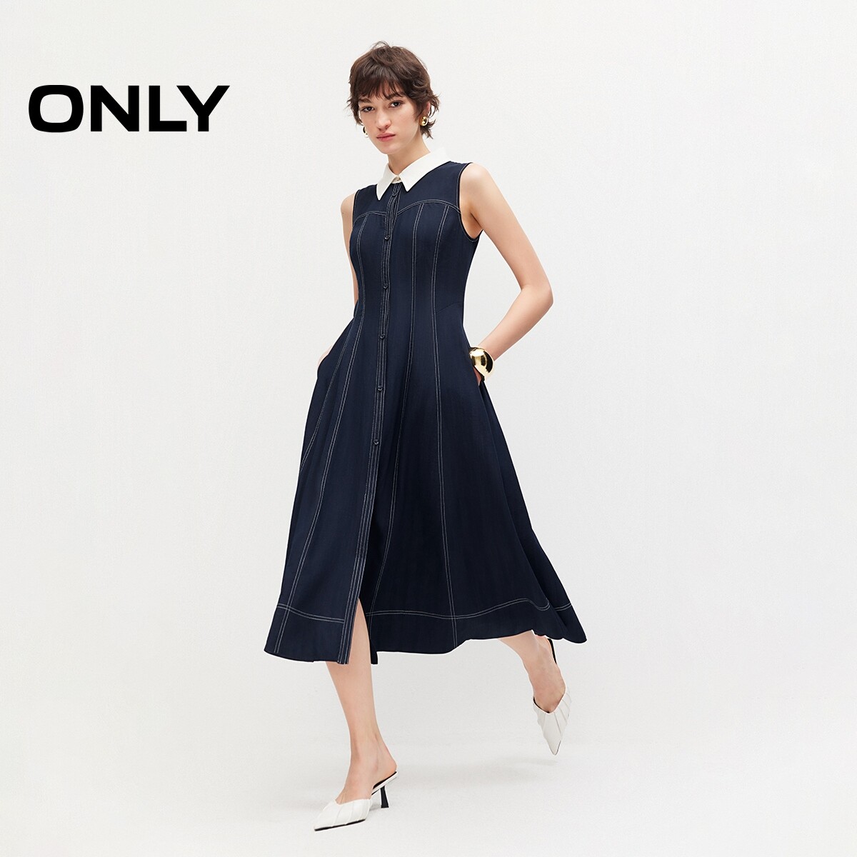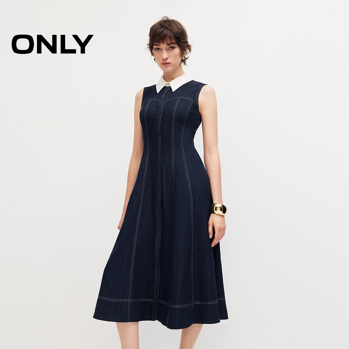 ONLY2026春季新款复古交叉系带撞色翻领无袖中长款衬衫裙连衣裙女