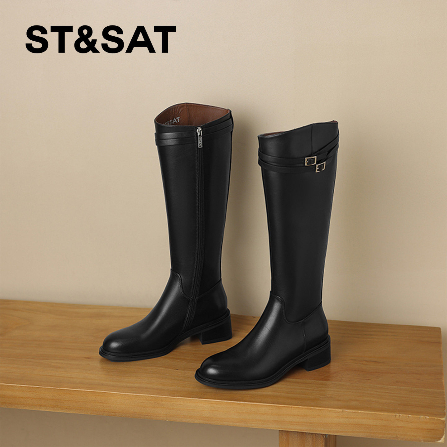 真皮~骄屿秋冬新款皮带扣长筒靴女通勤不过膝骑士靴低跟复古长靴