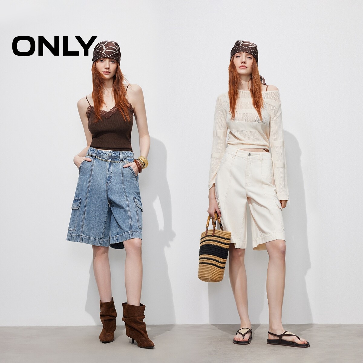 【百慕大】ONLY2026春季新款酷感个性工装口袋高腰五分短白牛仔裤