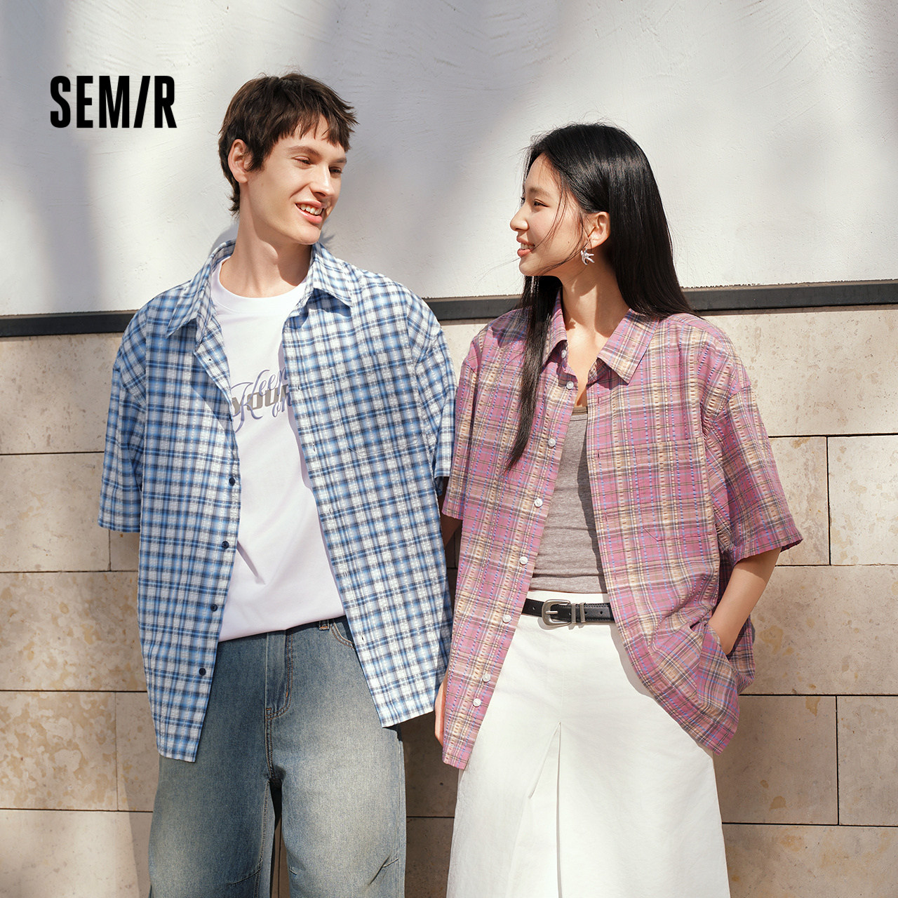 森马短袖衬衫男夏宽松格纹翻领上衣2026新款时尚情侣装衬衣休闲