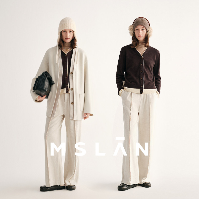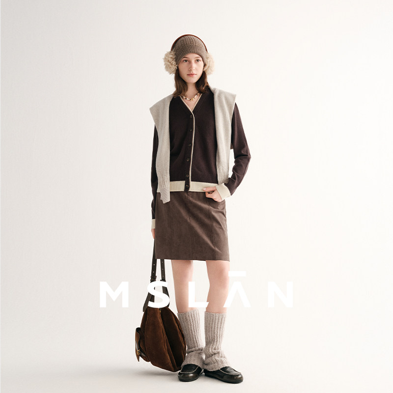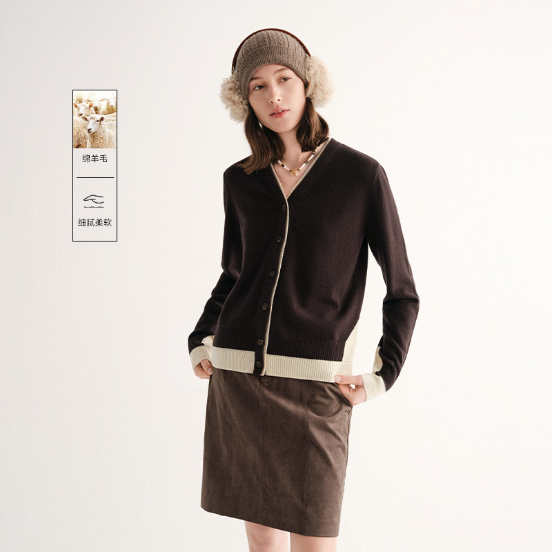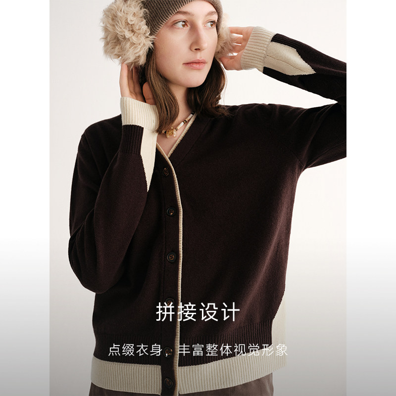 MSLAN焦糖拿铁 冬季撞色拼接V领羊毛针织衫软糯咖色圆领气质开衫