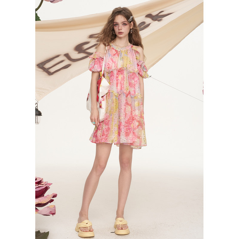 妖精的口袋多巴胺露肩挂脖连衣裙女2025夏新款气质设计感度假裙子