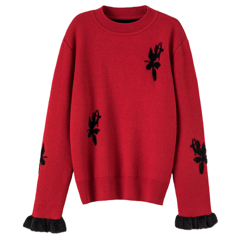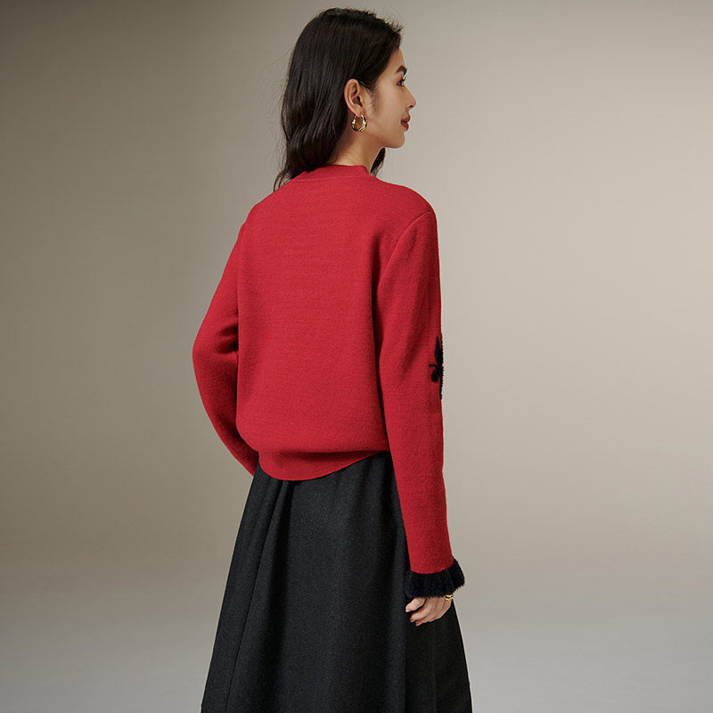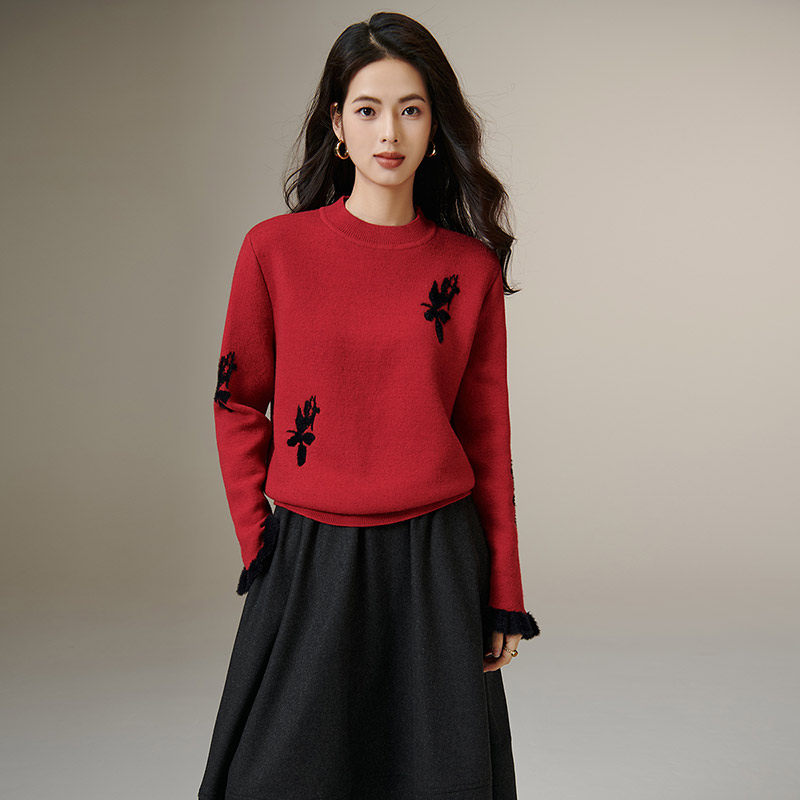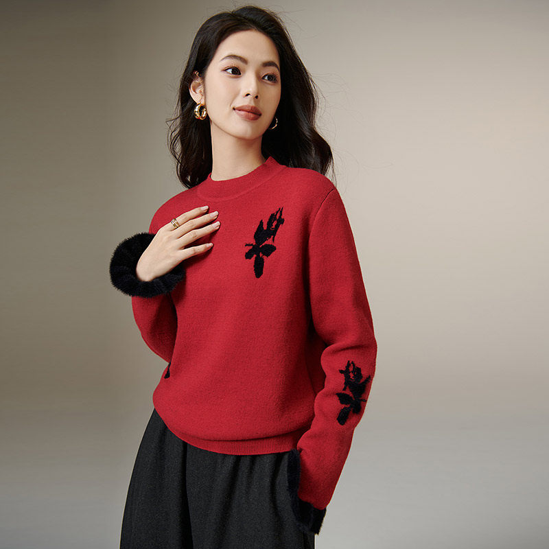 晚白冬款时尚气质中国红圆领毛衣宽松加绒保暖针织衫