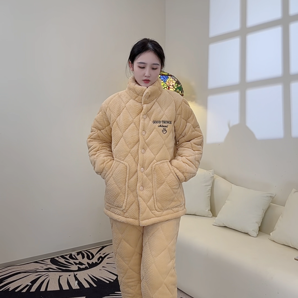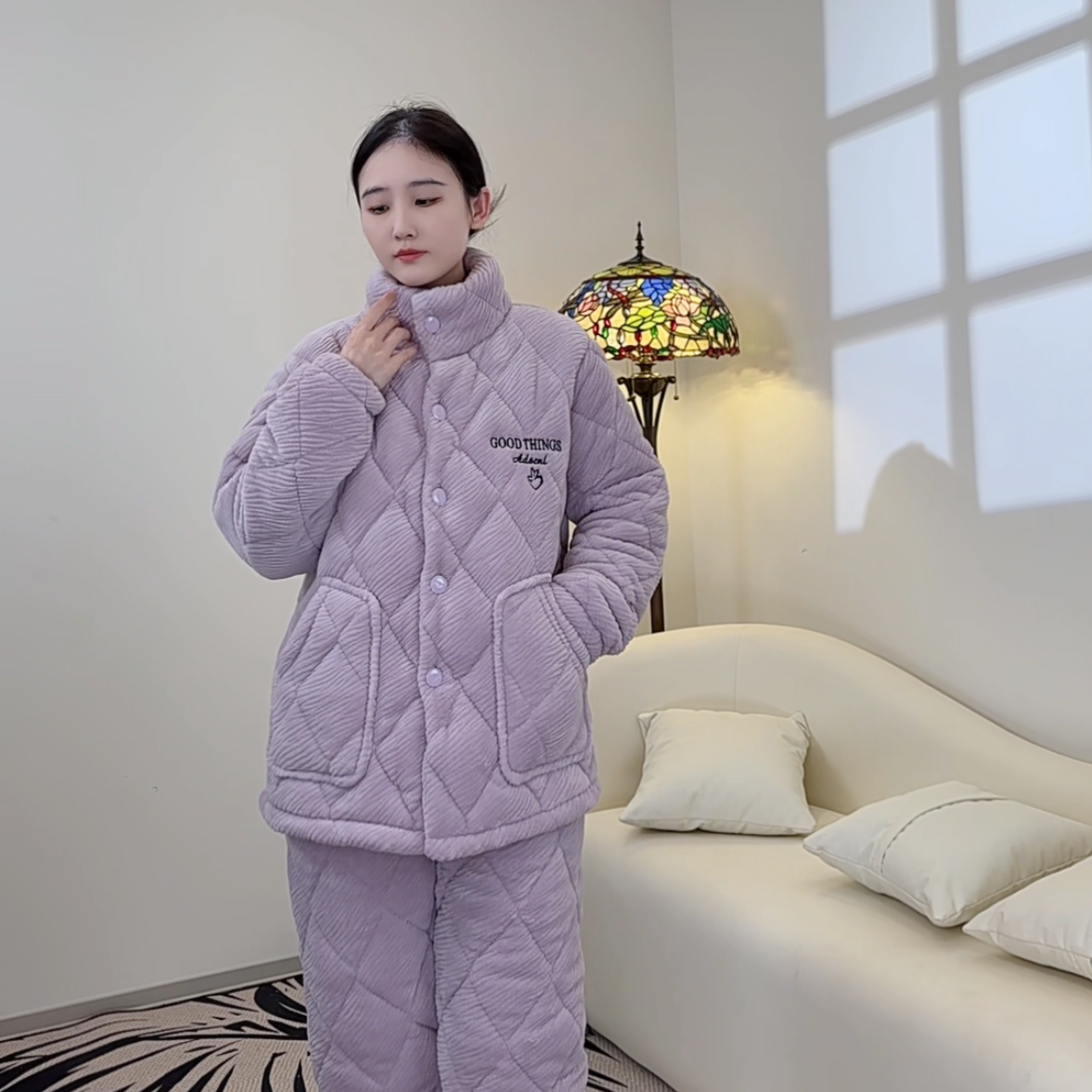 2024冬季新款女士睡衣三层加厚保暖法兰绒夹棉加绒外穿家居服套装