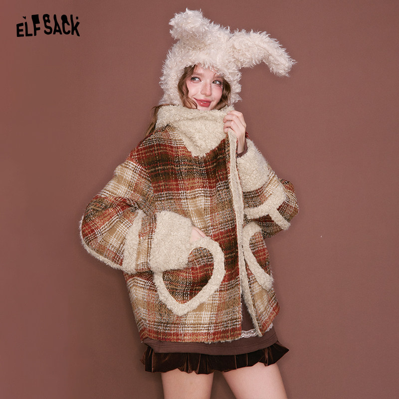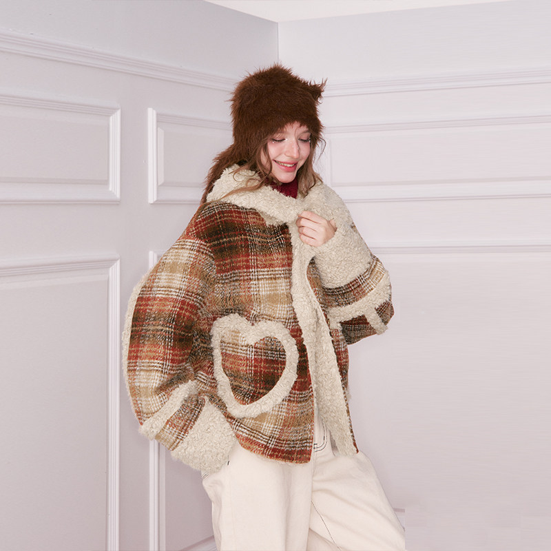 妖精的口袋仿毛绒格纹拼接夹棉短款毛呢外套女2025冬新款新年战袍