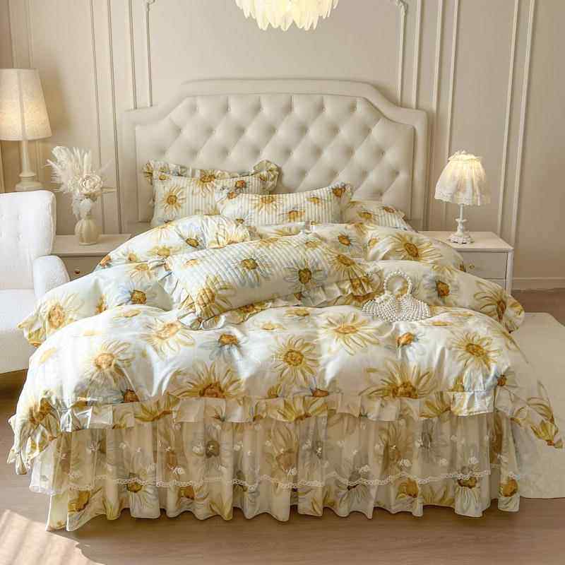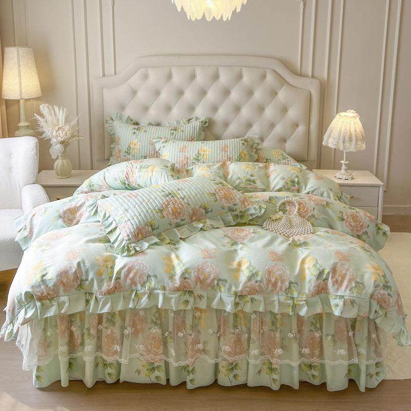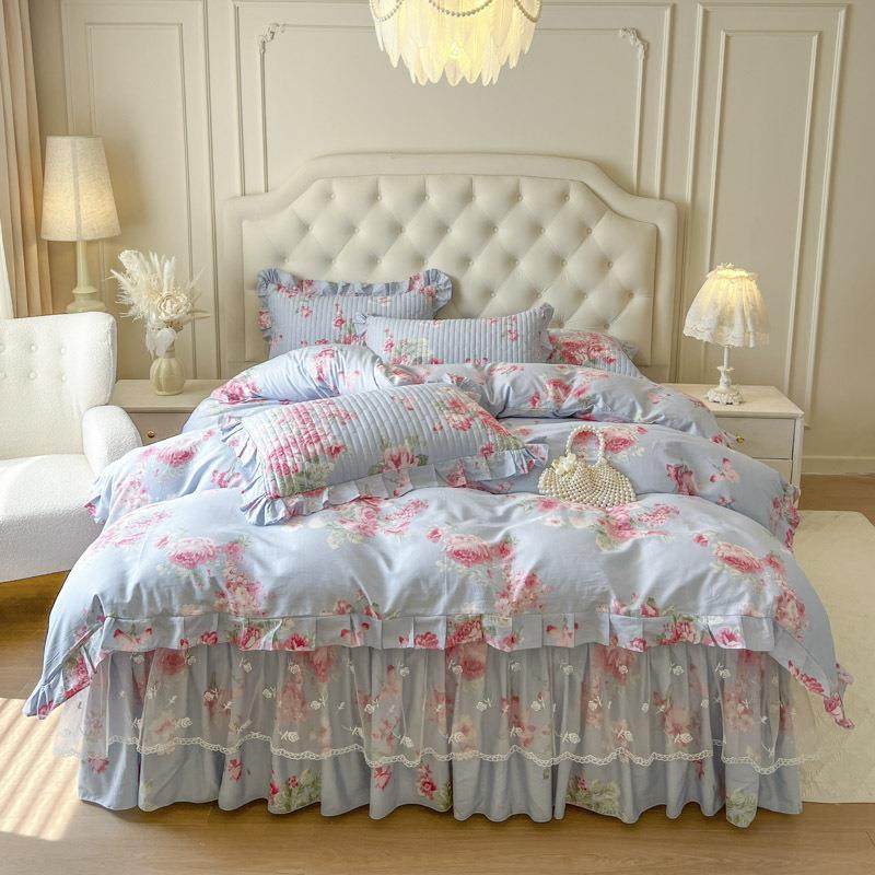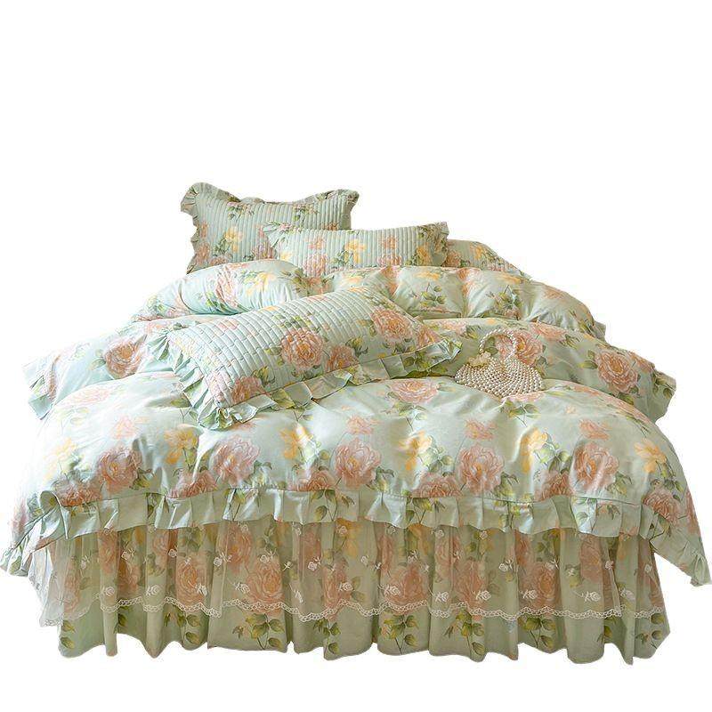 全棉蕾丝花边印花床笠裙四件套四季可用公主风纯棉被套床裙四件套