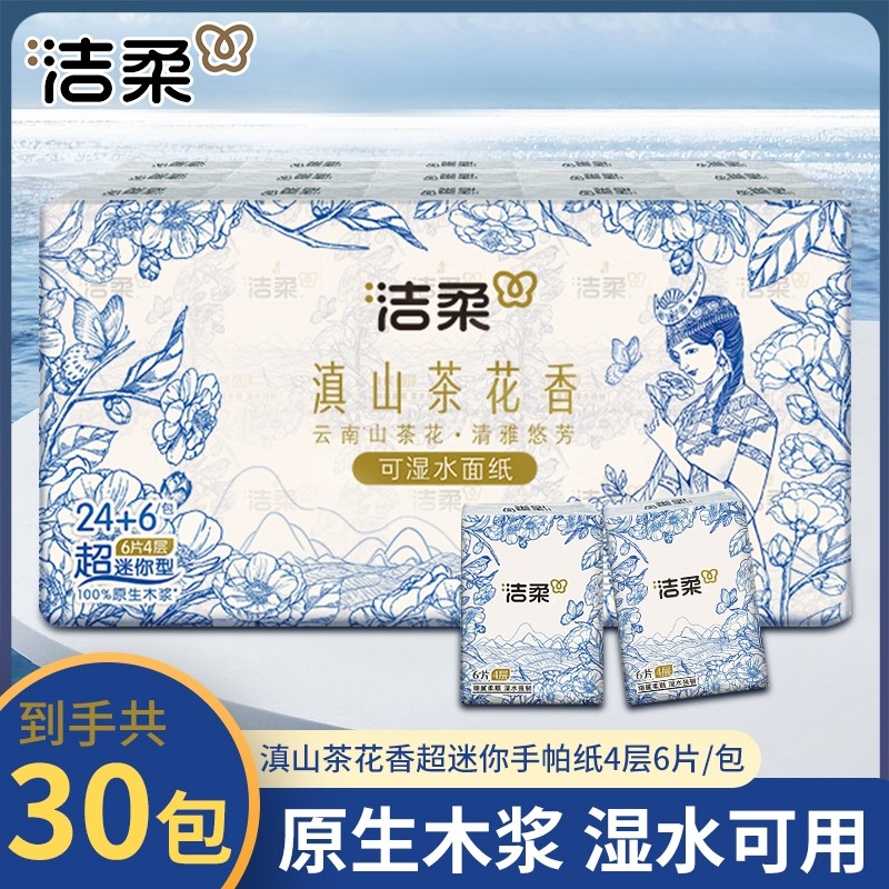 洁柔手帕纸滇山茶花香4层30包小包纸巾式面巾纸随身装餐巾纸抽