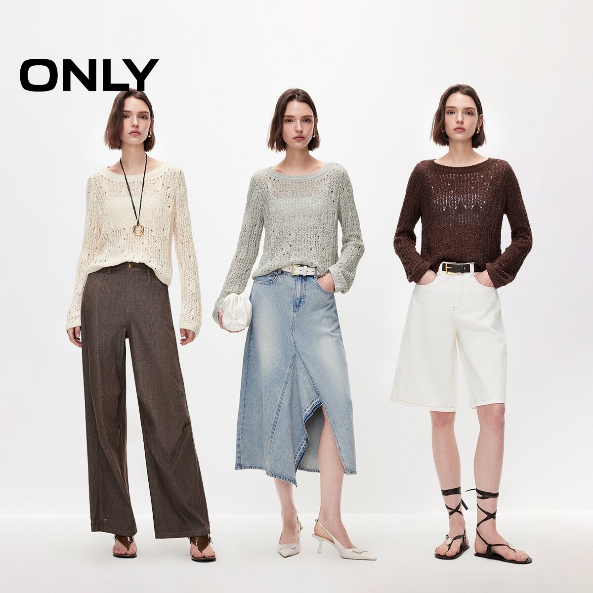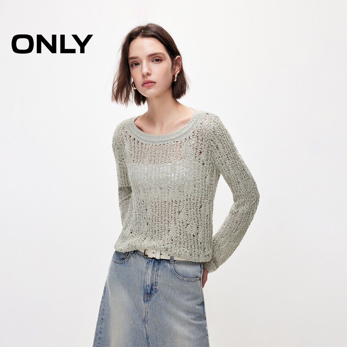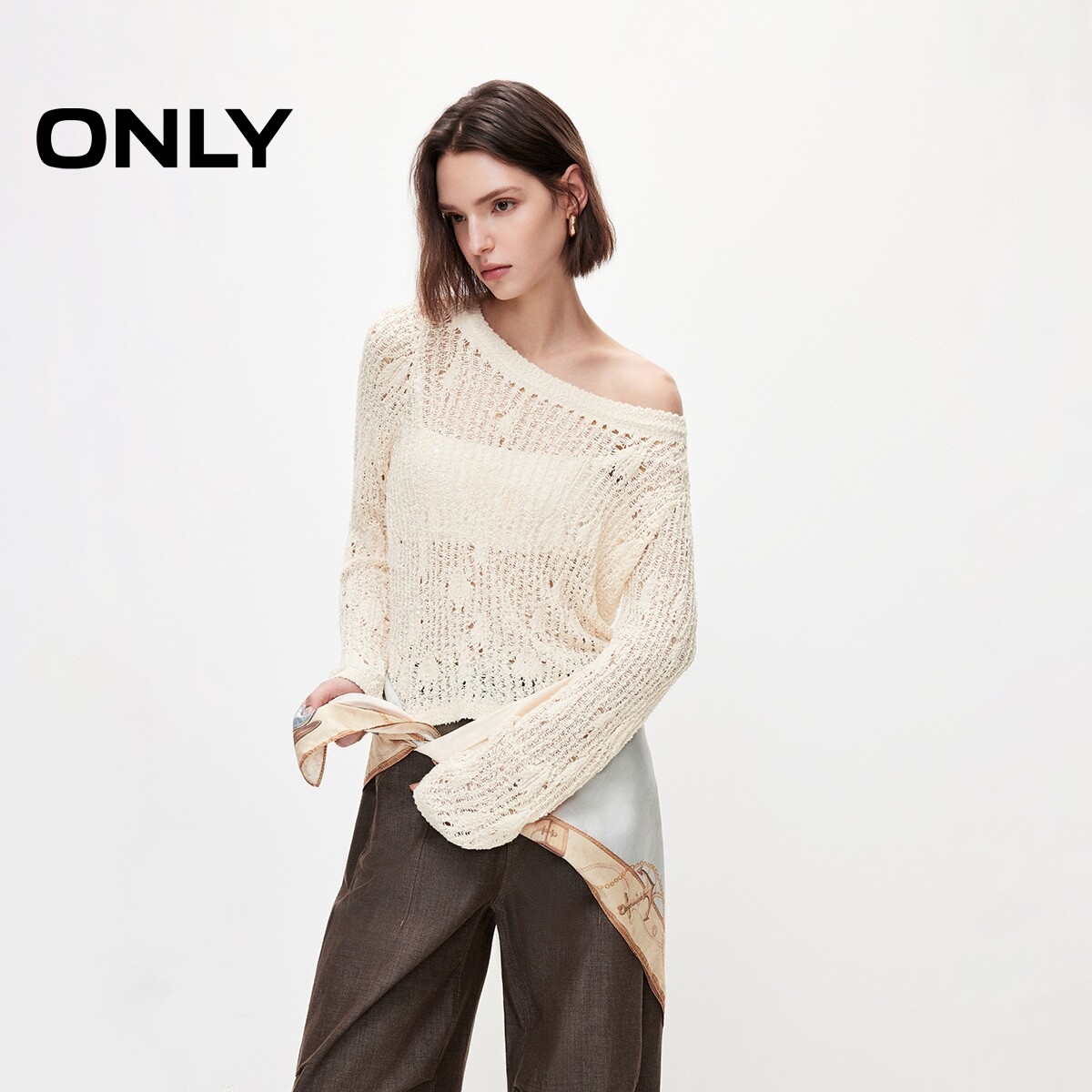 ONLY2026春季新款舒适落肩透气立体钩花镂空编织长袖针织衫上衣女
