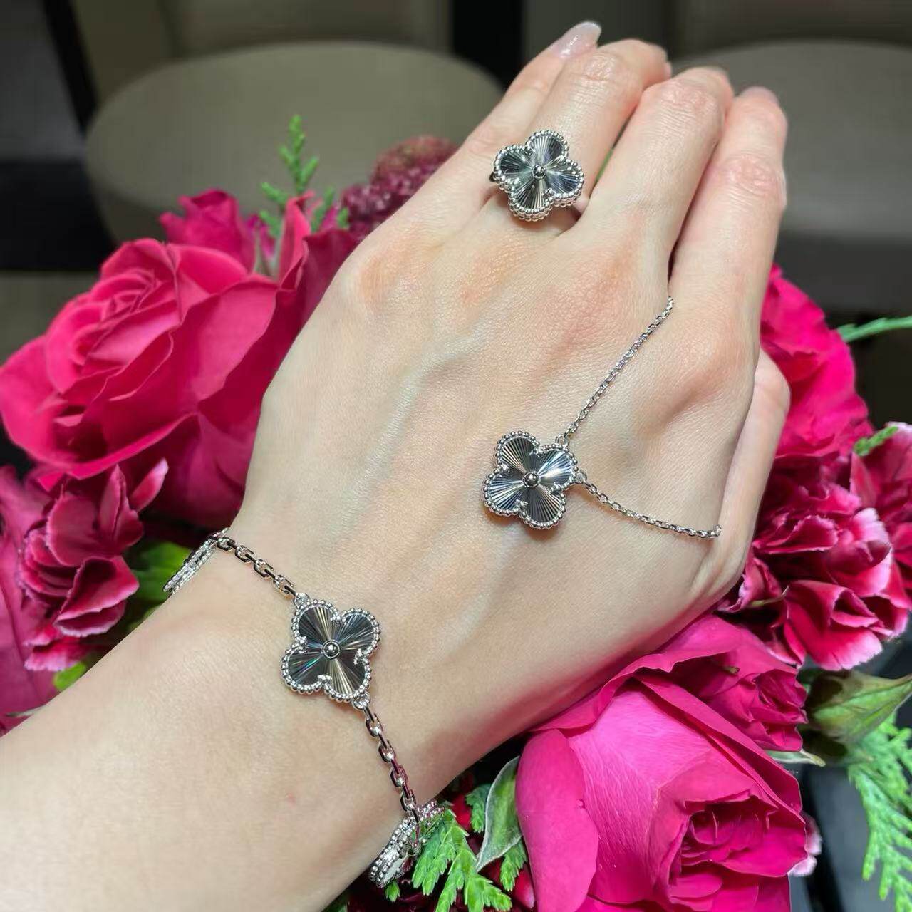 全新高定品质银渡18k金镭射幸运草项链金镭射五花手链十花项链