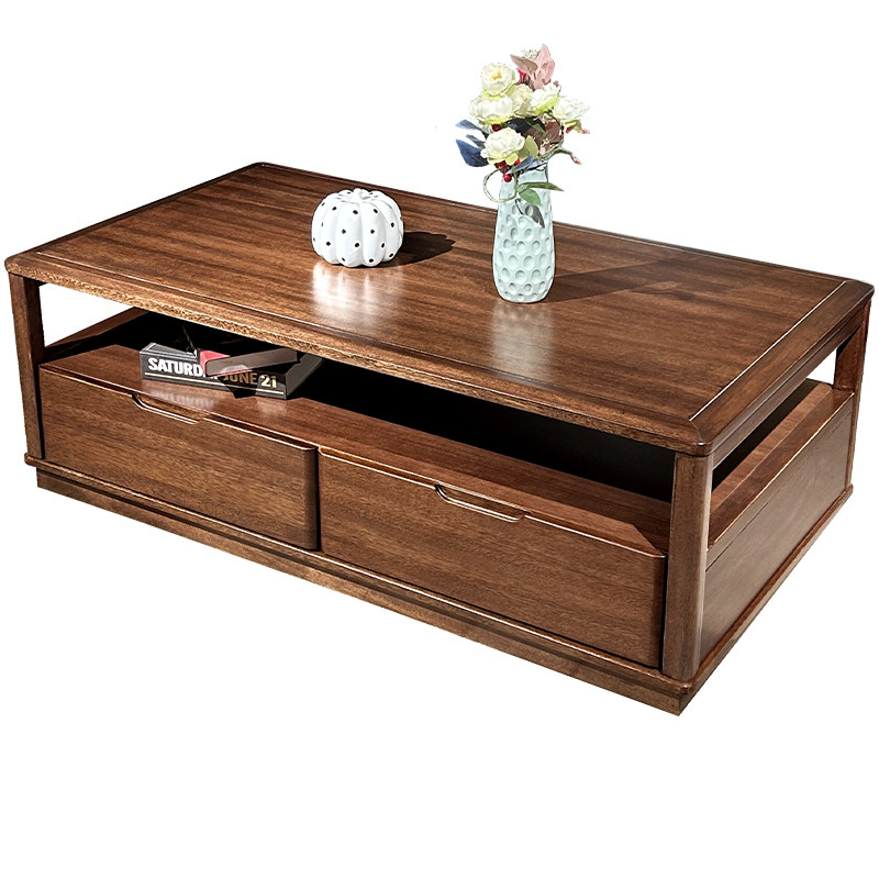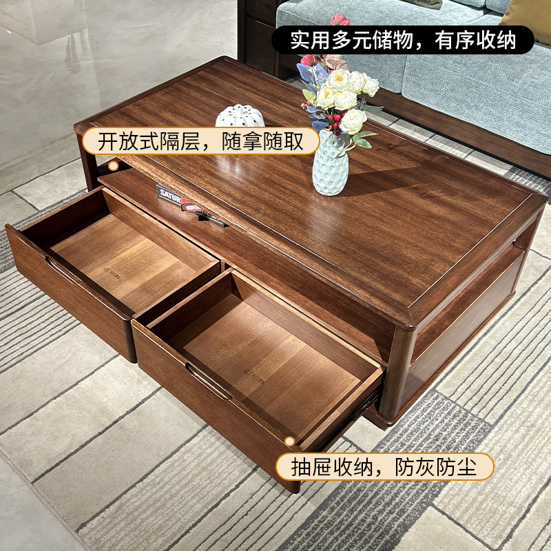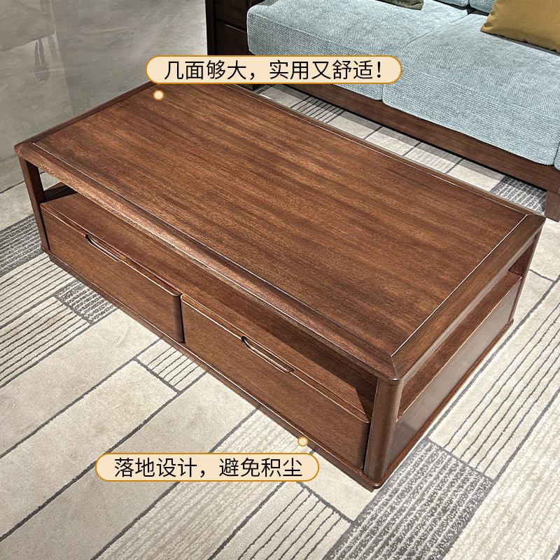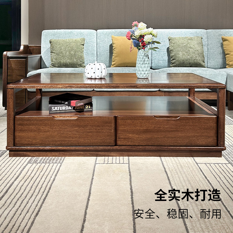 全实木茶几小户型家用客厅现代简约胡桃木长方形茶桌带抽屉双层