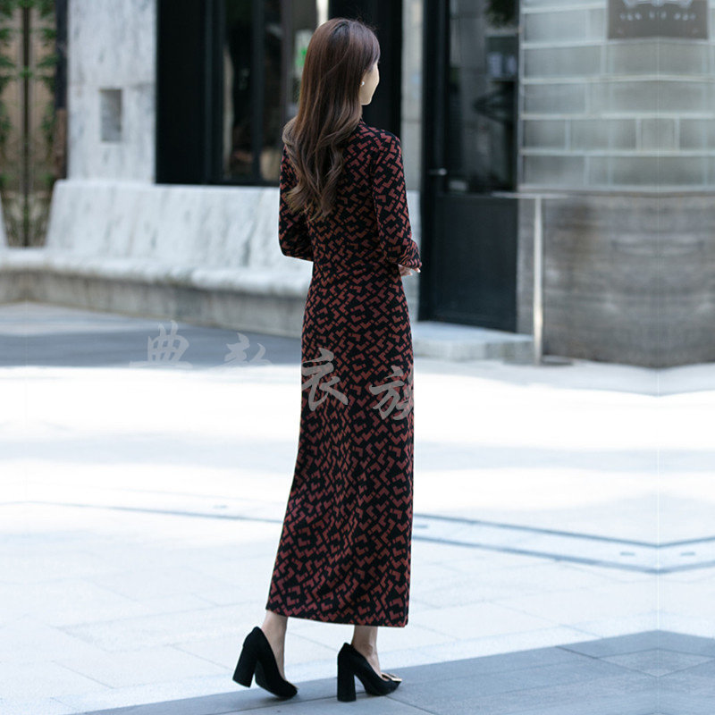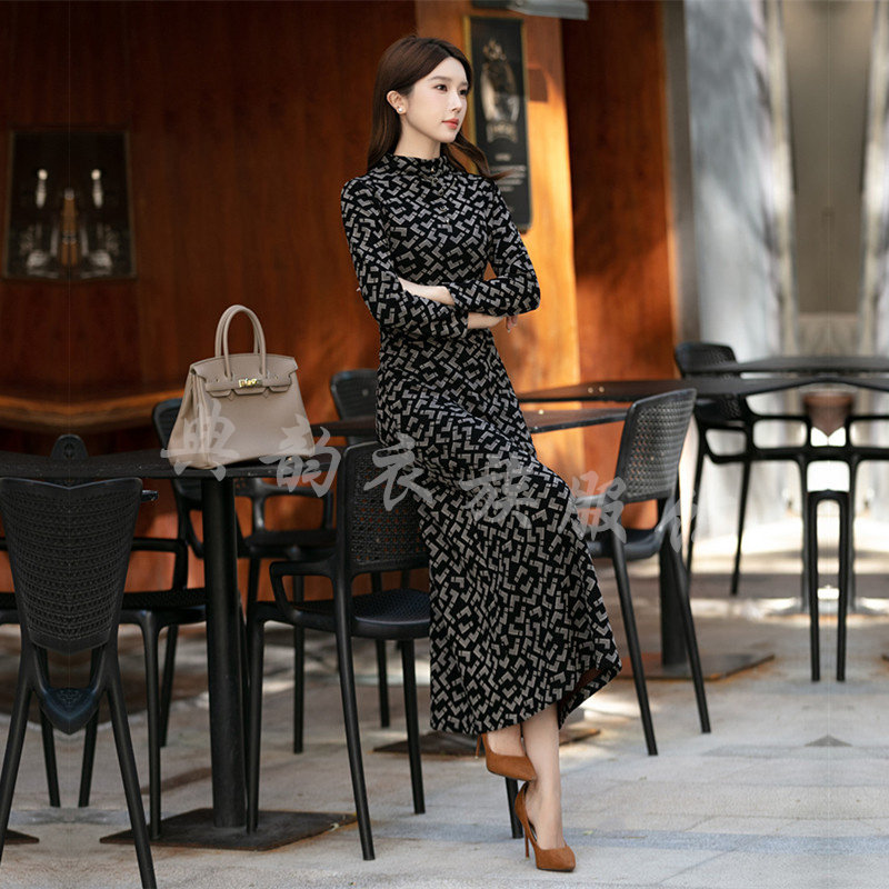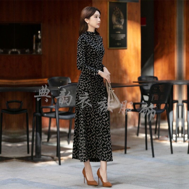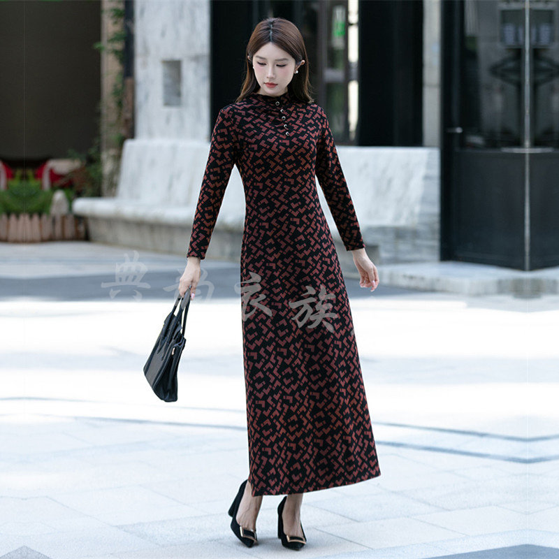 澳绒秋冬新款加绒收腰超长款连衣裙简约洋气立领过膝打底长裙显瘦