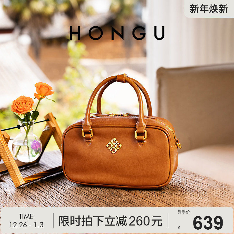 红谷包包女2025新款植鞣牛皮单肩手提包通勤高级感波士顿包女士包