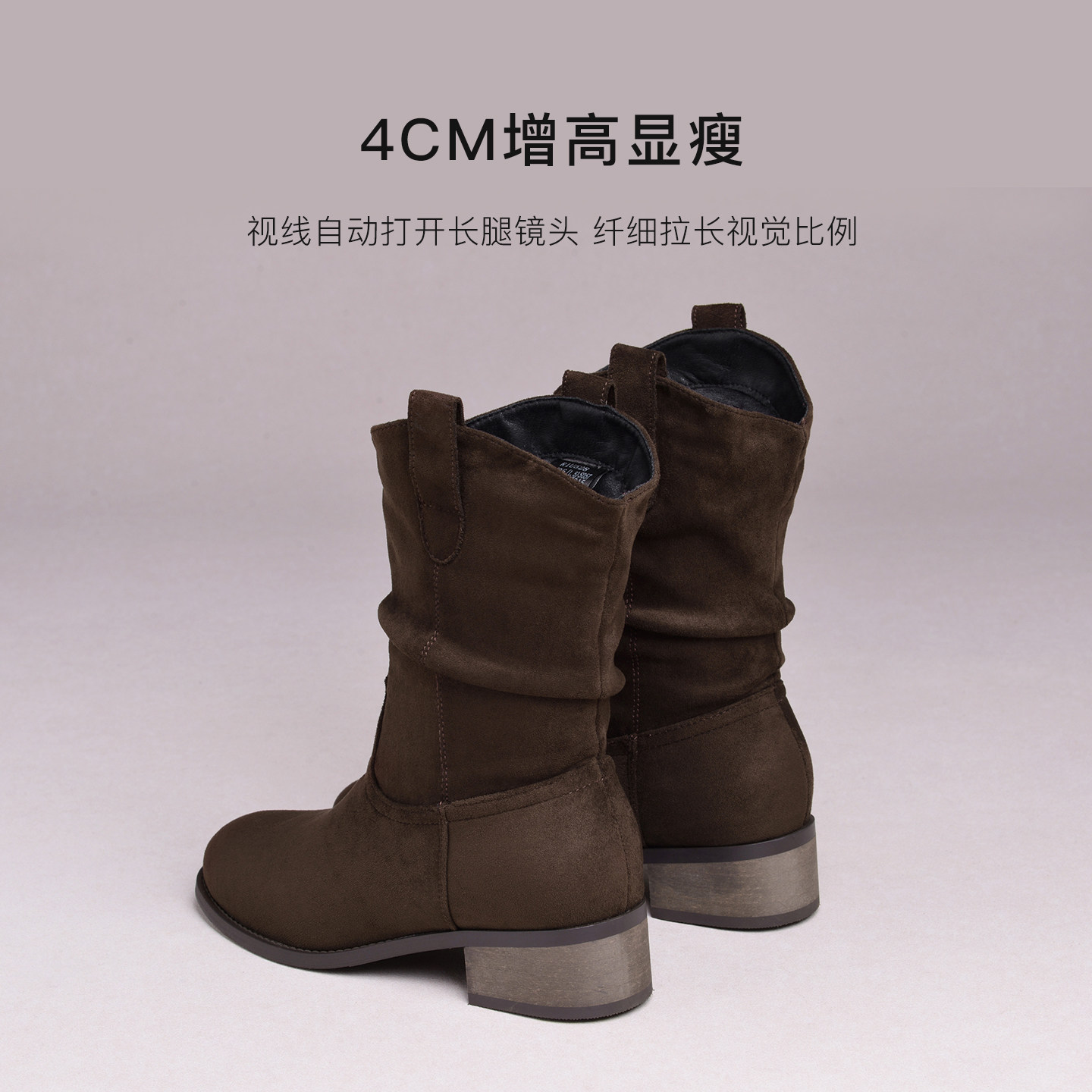 棕色靴子!小个子内增高7CM法式方头靴2025冬新款绒面粗跟短靴女