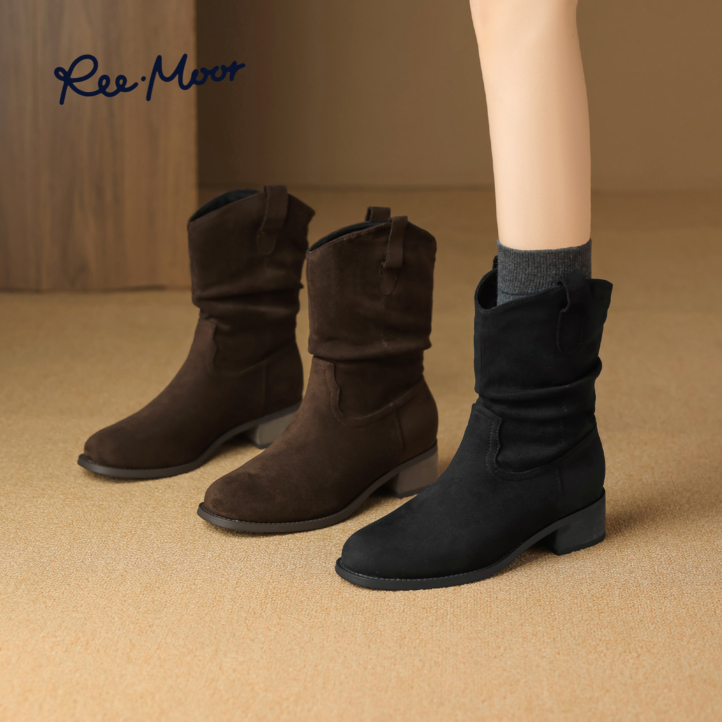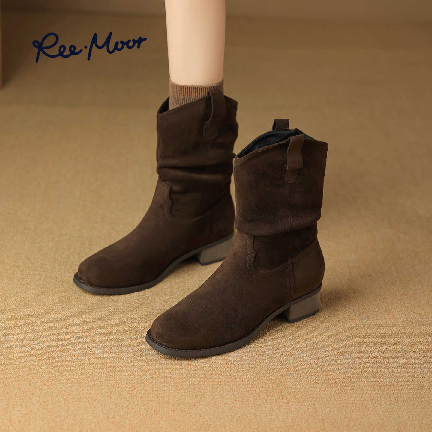 REEMOOR睿慕2025冬季新款美拉德复古西部堆堆靴中筒粗跟短靴女