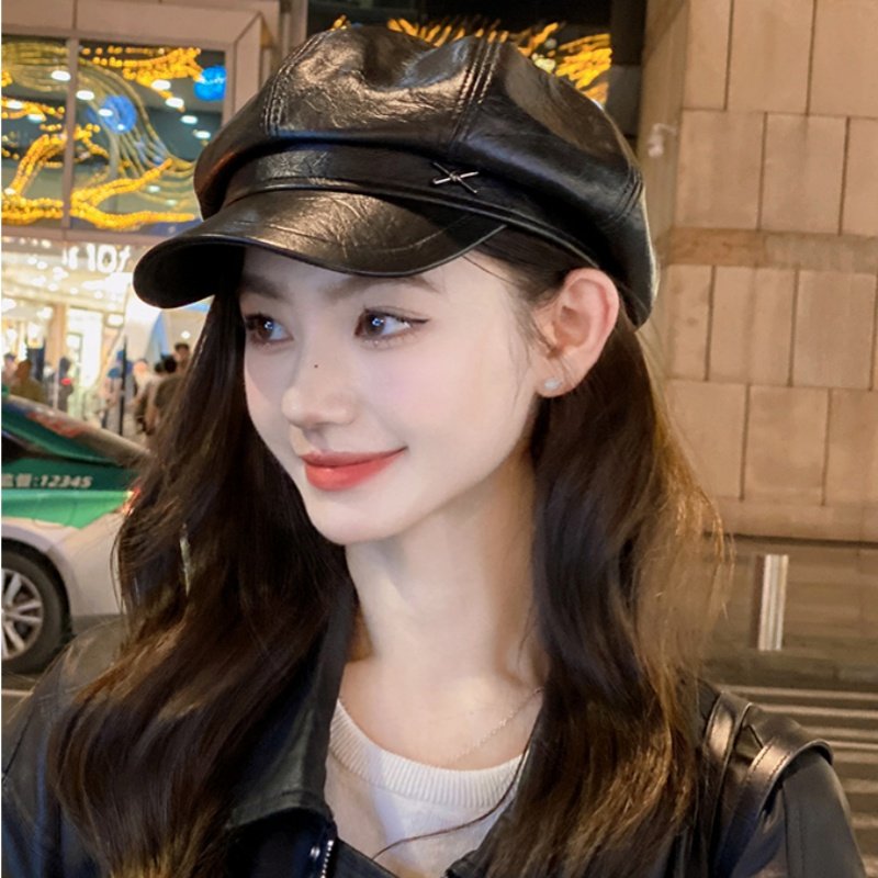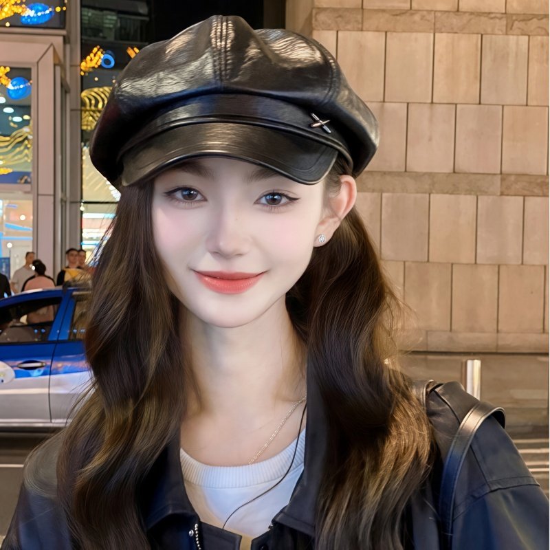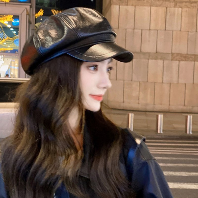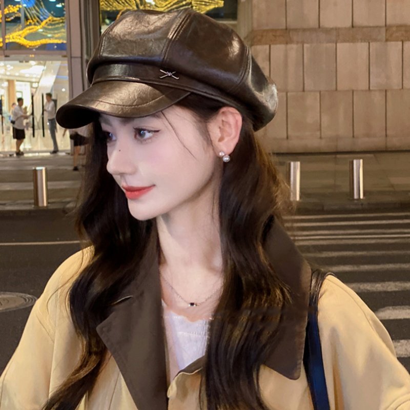 复古皮质棕色八角帽女2025新款海军贝雷帽英伦风百搭显脸小报童帽