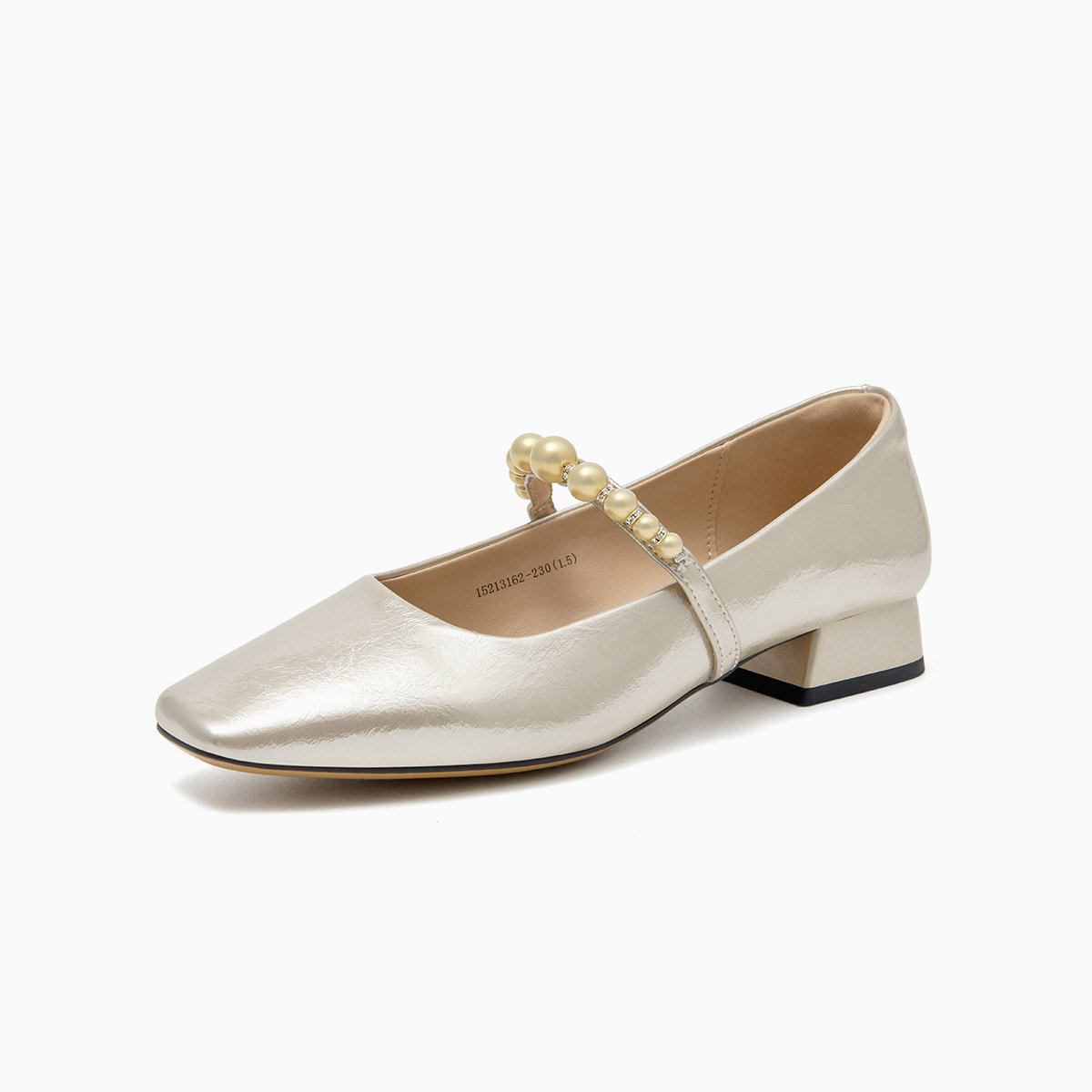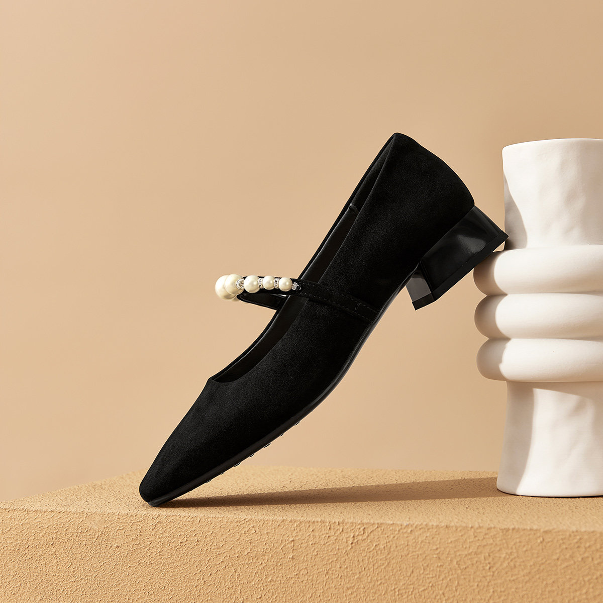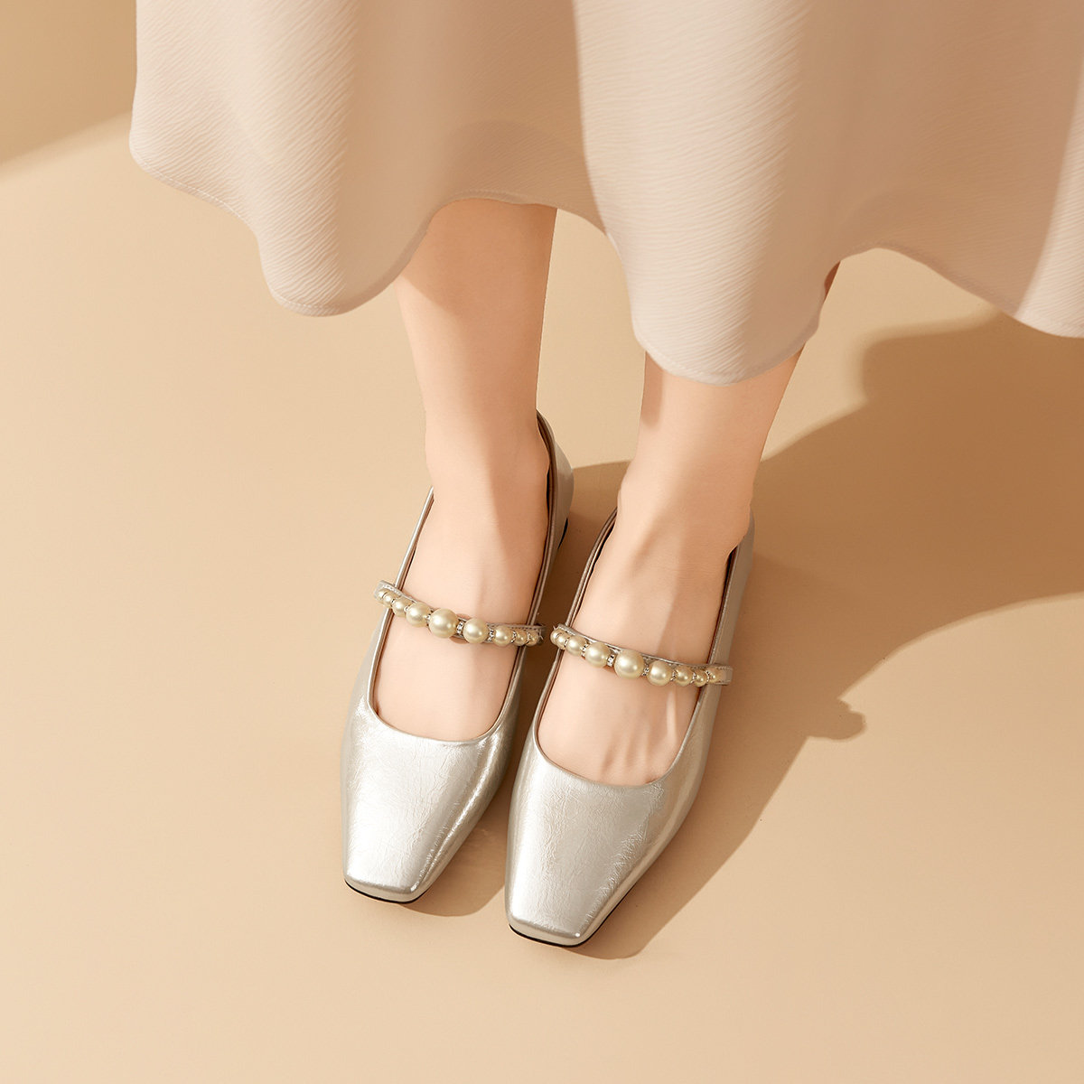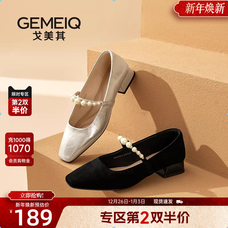 戈美其商场同款法式珍珠一字带玛丽珍鞋女2025新款秋季粗跟小单鞋