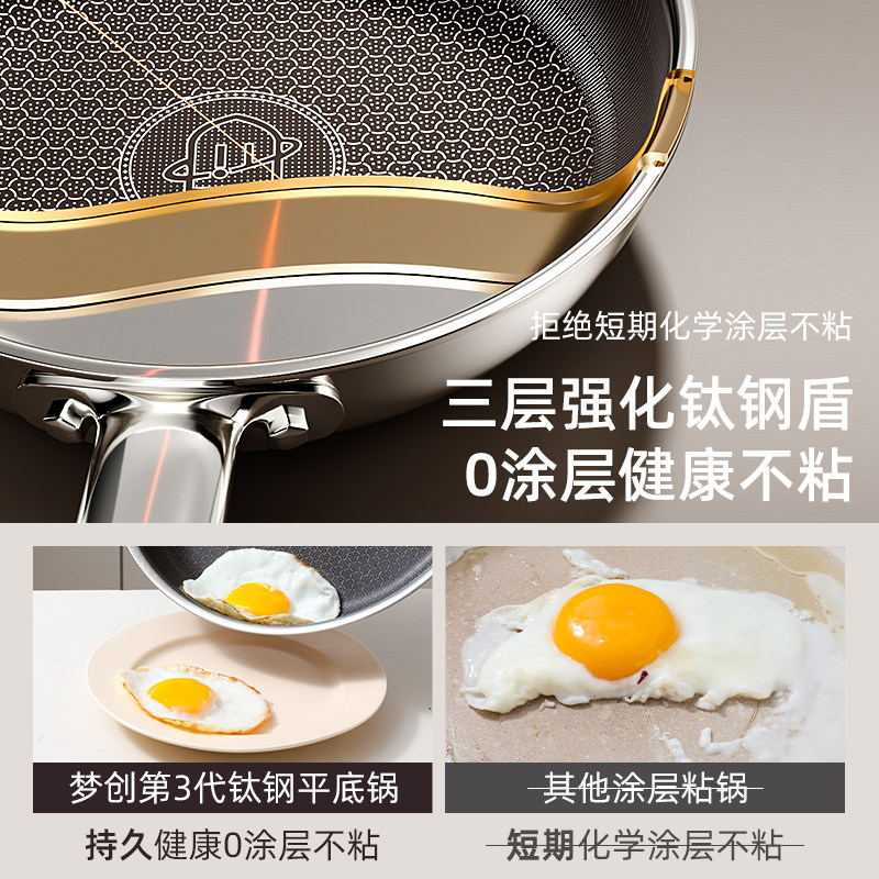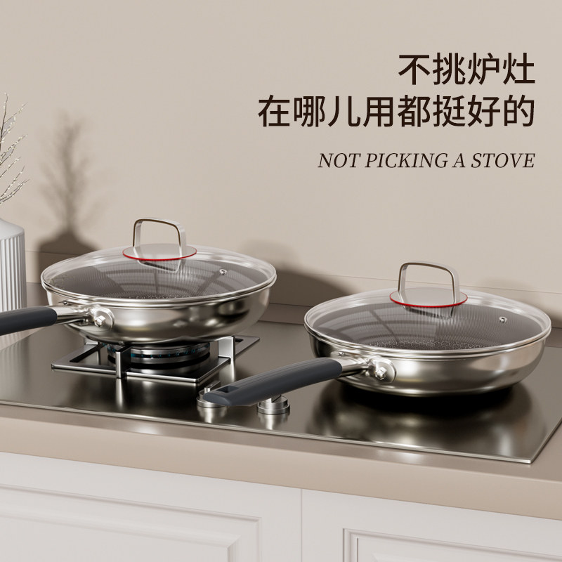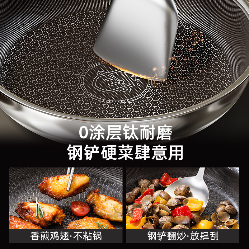 钛钢无涂层平底锅不锈钢不粘锅家用炒菜锅电磁炉煤气灶不沾深煎锅
