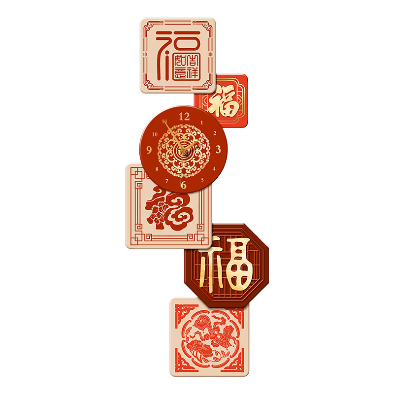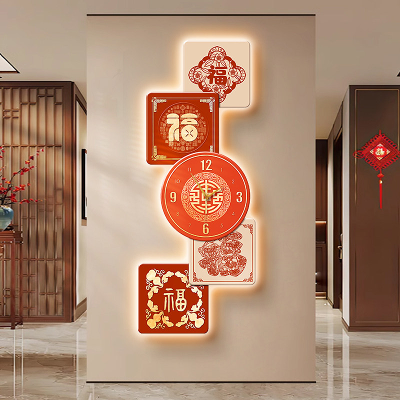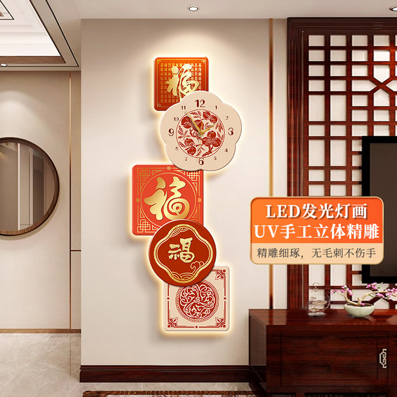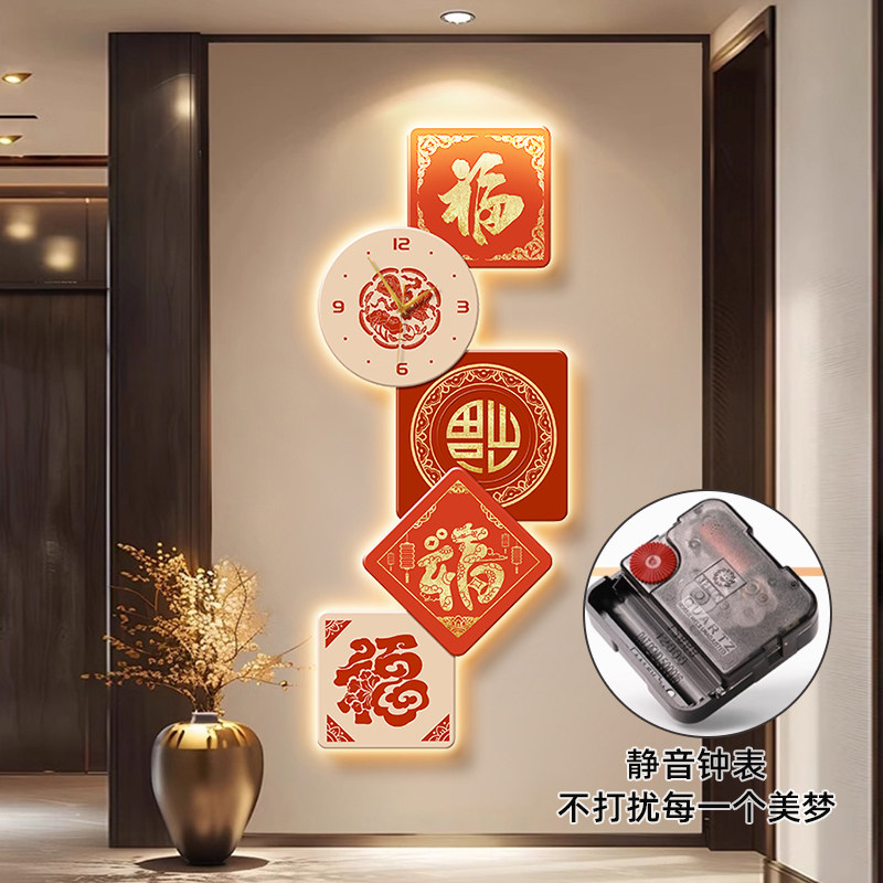 新中式玄关装饰画福字带钟表氛围灯画入户对门高级感时钟发光壁画