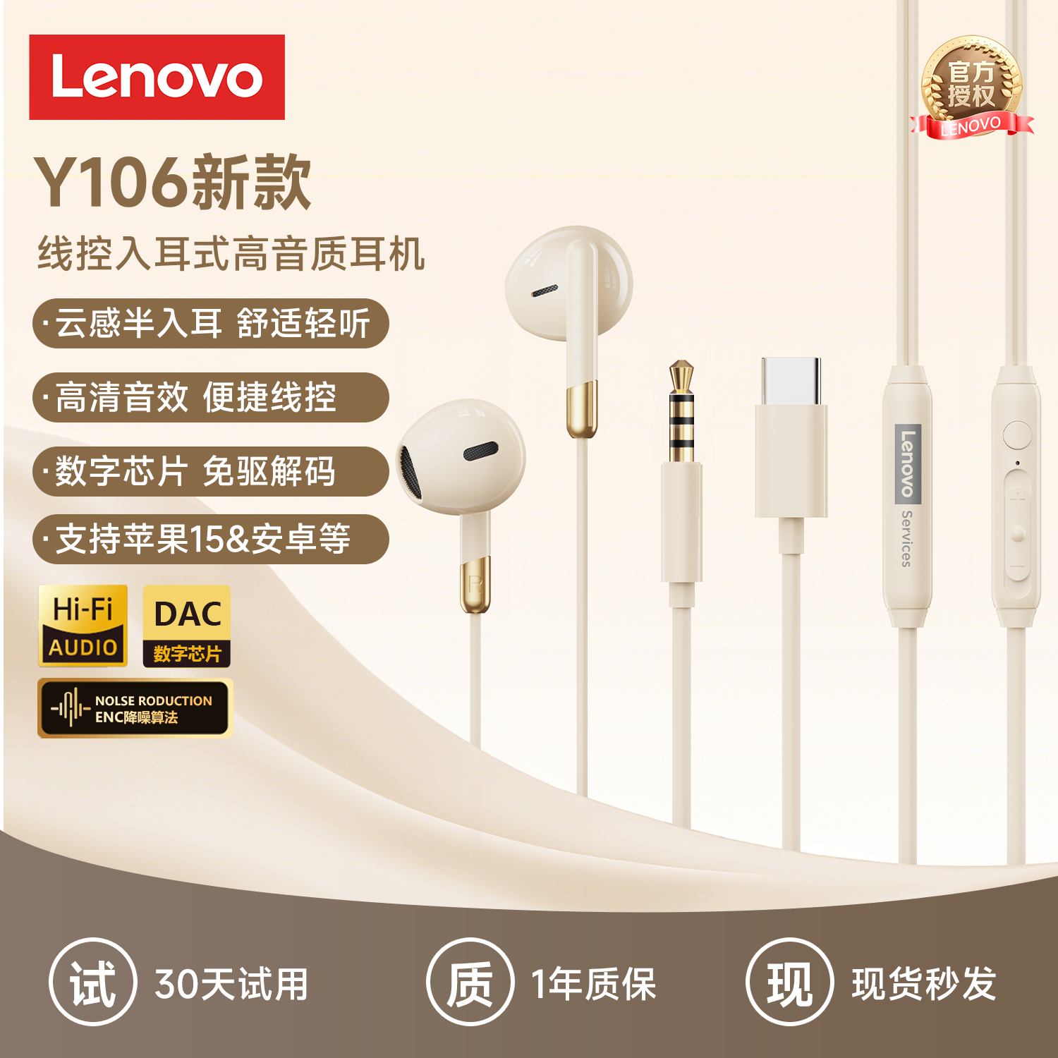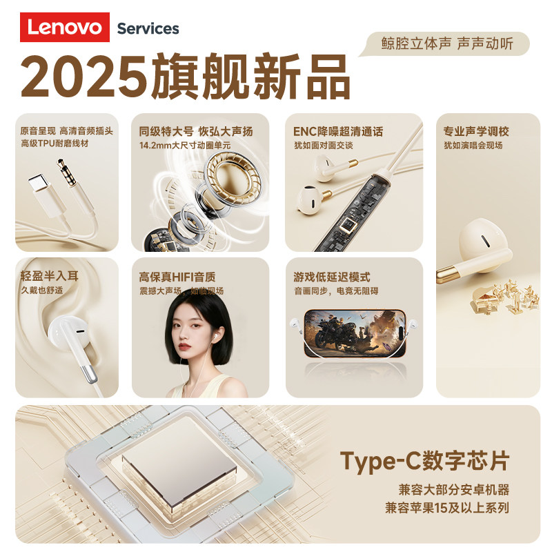 联想Y106半入耳式有线耳机TypeC接口线控vivo安卓华为苹果通用