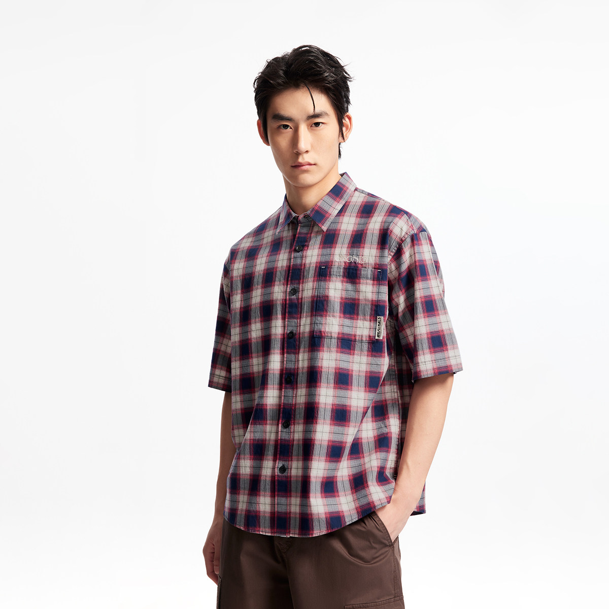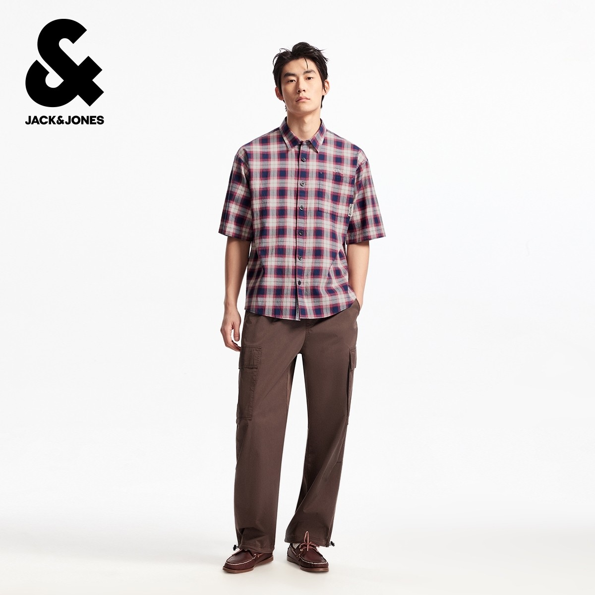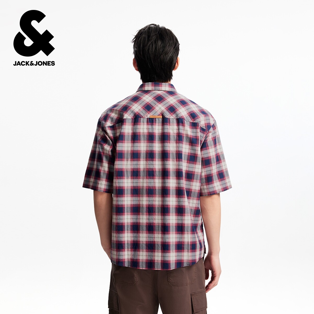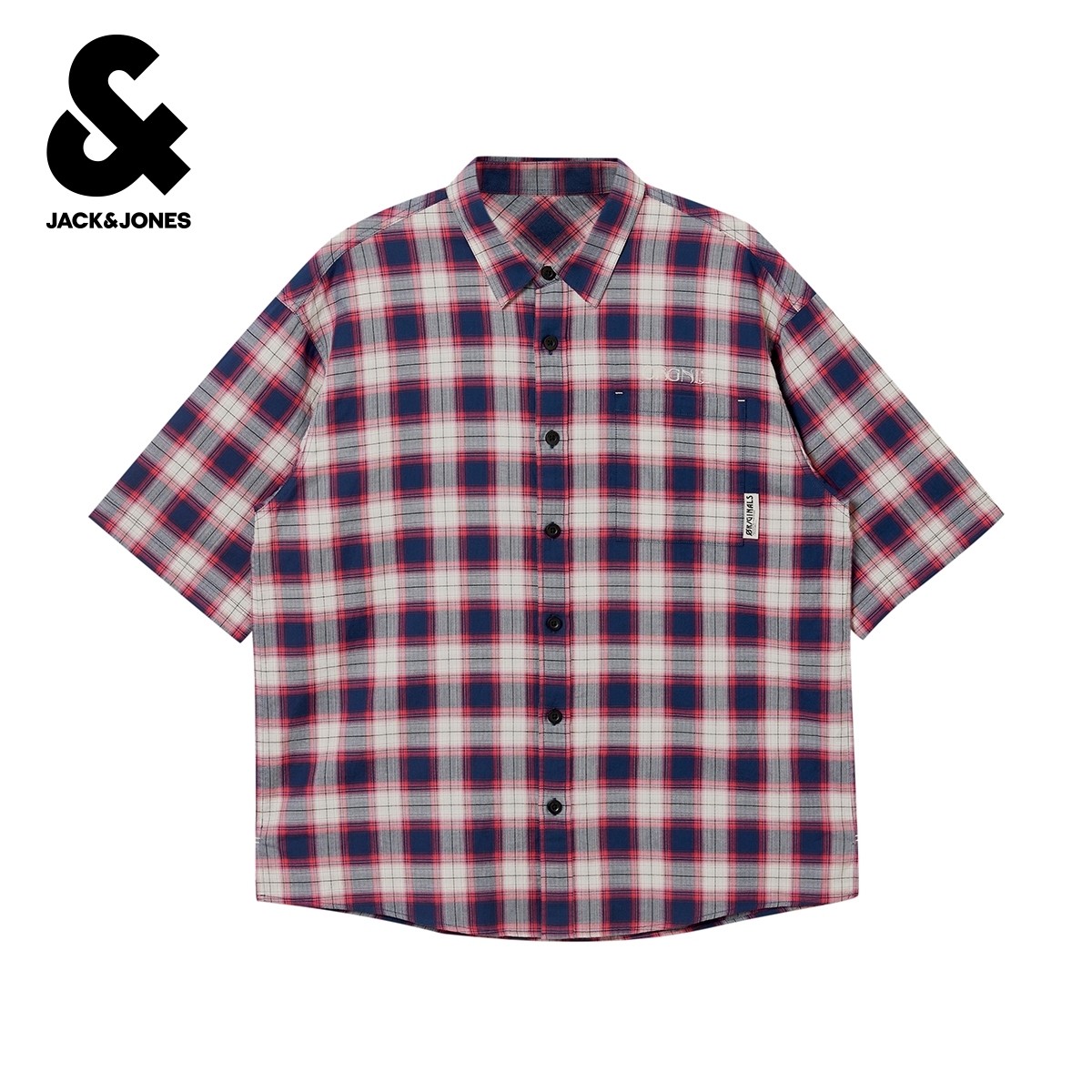 杰克琼斯奥特莱斯男装夏季新款时尚英文刺绣格纹翻领短袖衬衫上衣