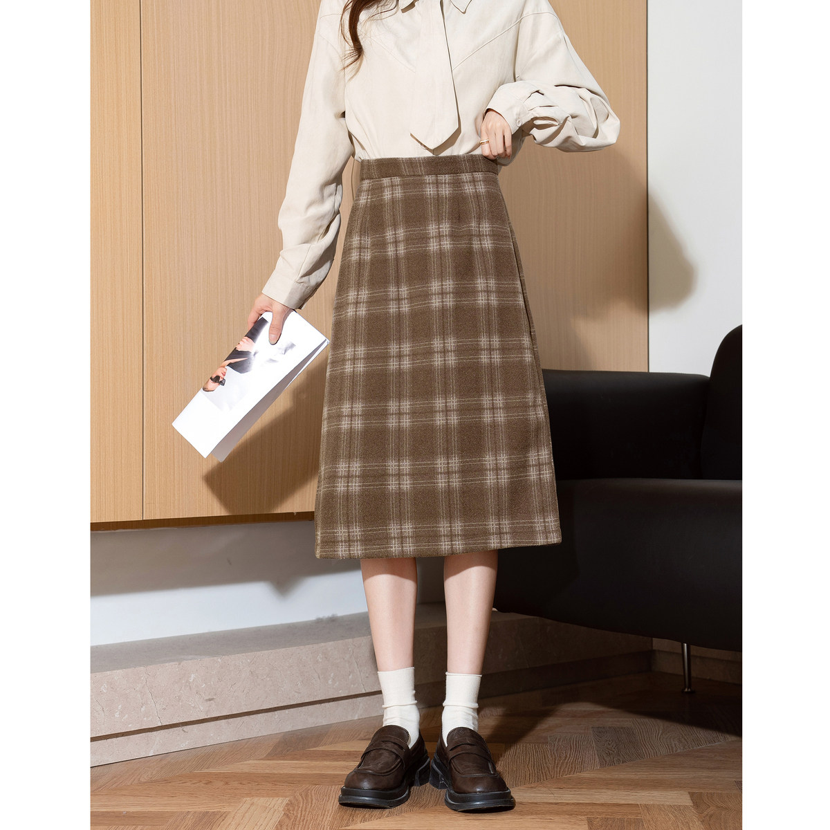 唐狮格子毛呢半身裙女冬新款美拉德包臀裙一步裙子复古长裙TE
