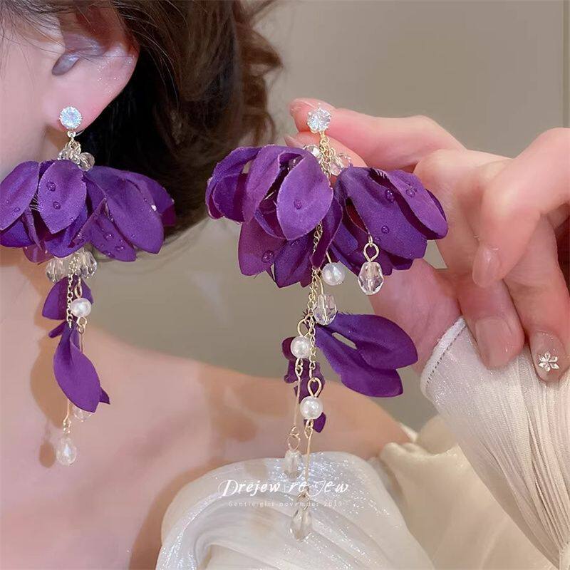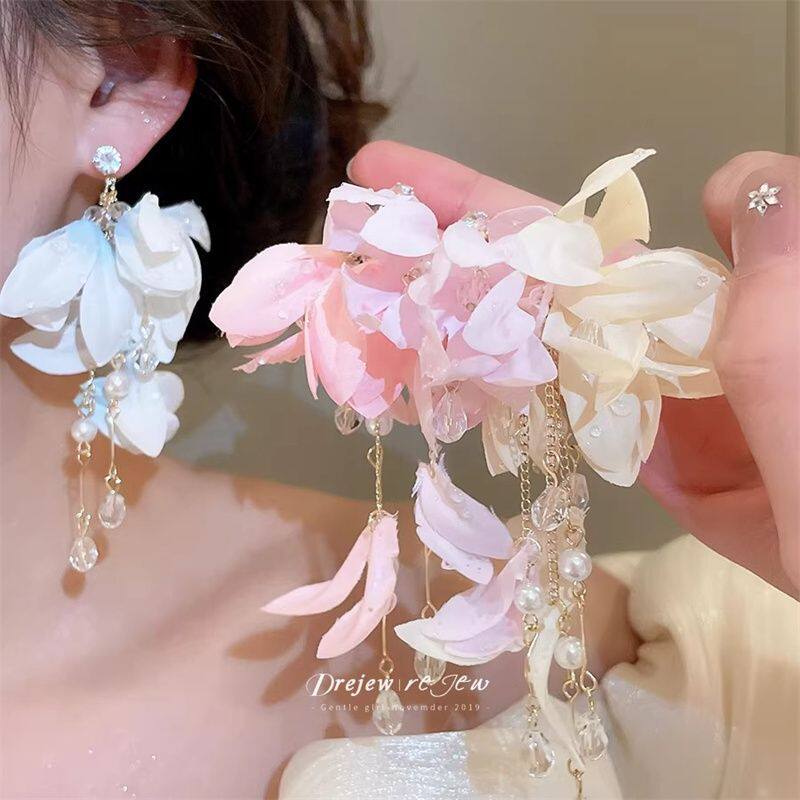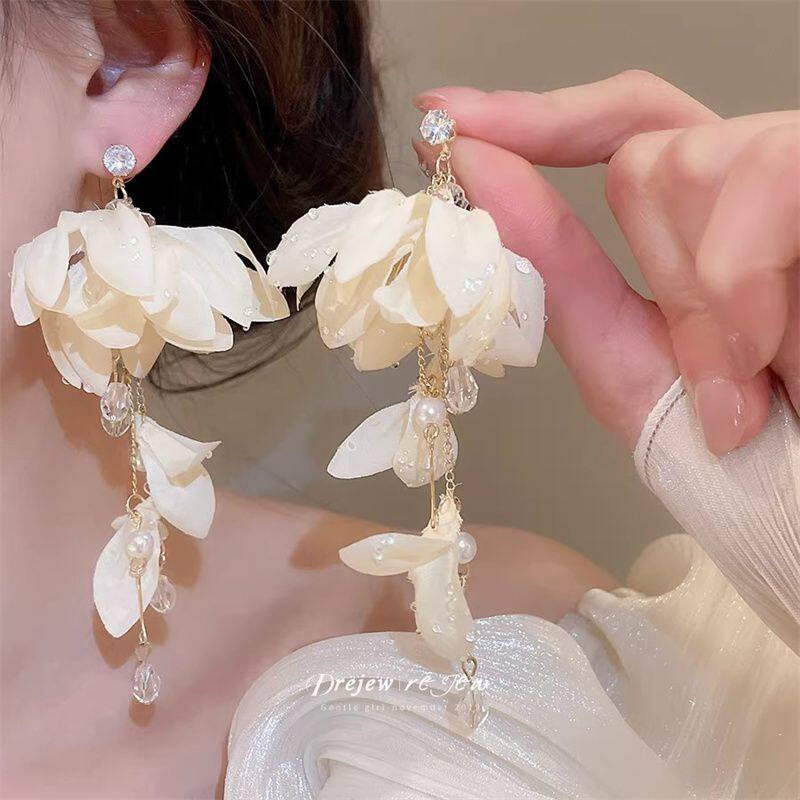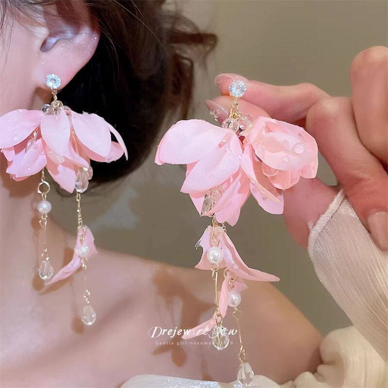 珍珠布艺花朵吊坠耳钉清新甜美气质耳环小众设计巨好看耳饰女款