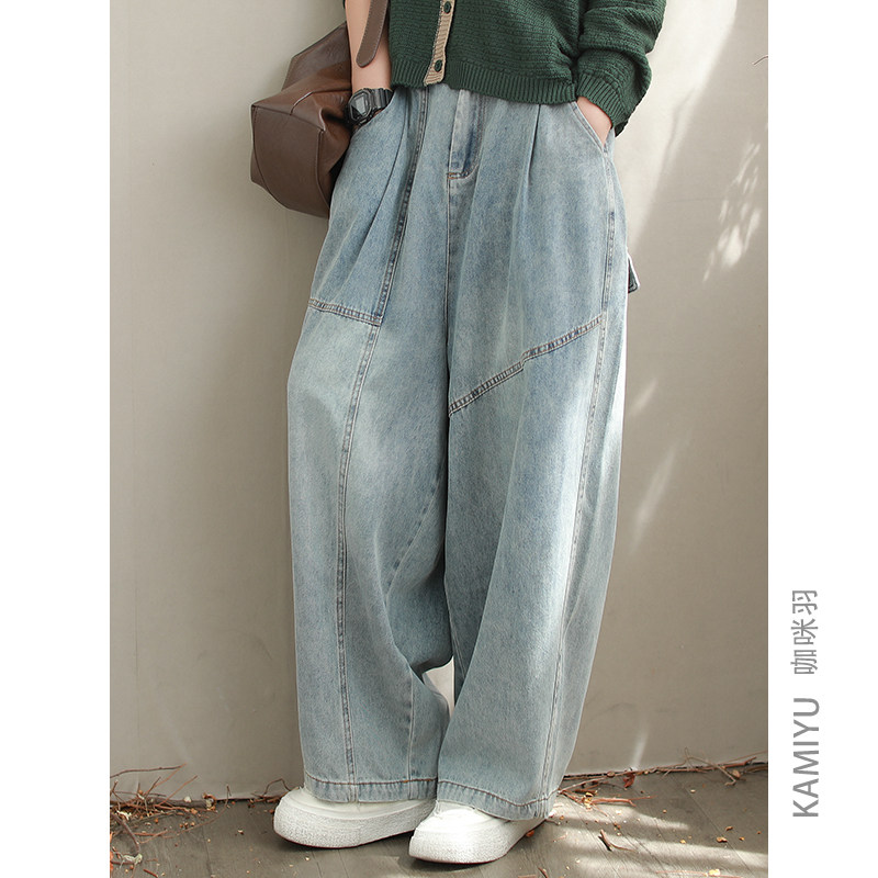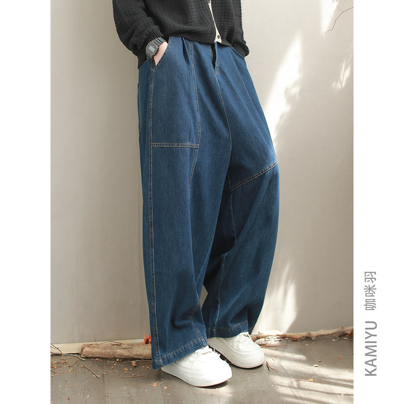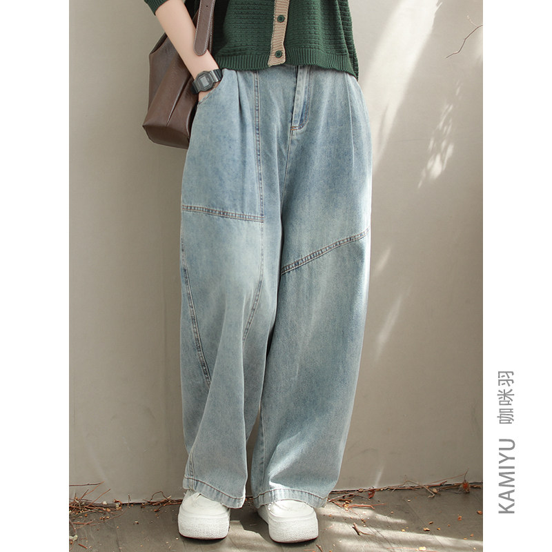 咖咪羽牛仔裤女秋装新款直通蓝色宽松拼接大码时尚休闲女装哈伦裤