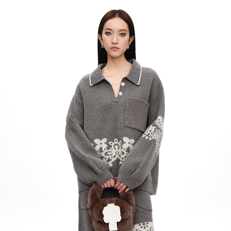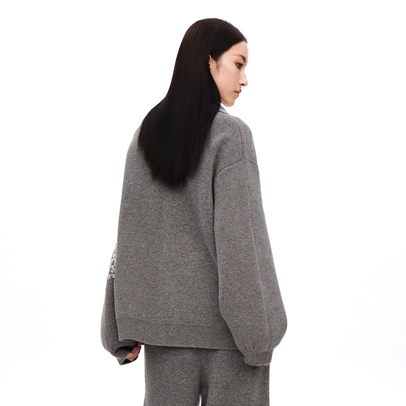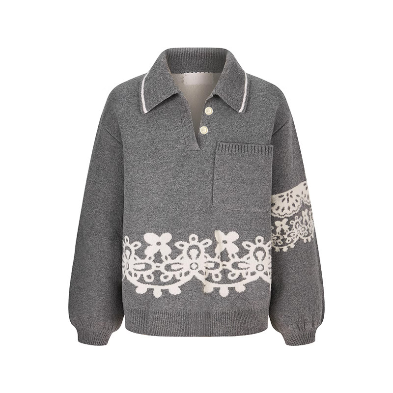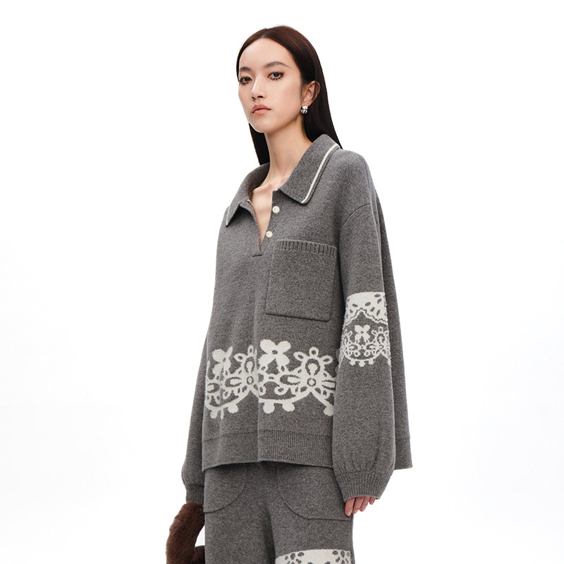 【设计师品牌XIAOLI筱李】秋冬格雷系羊毛衣外套蕾丝提花宽松卫衣