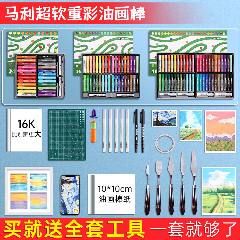 马利油画棒48色diy画儿童超软安全无毒油画棒套装软性重彩不脏手蜡笔专业小学生手绘画笔刮刀专用纸马卡龙