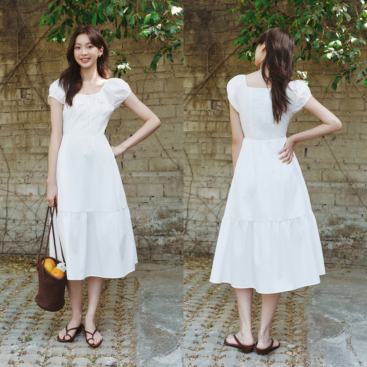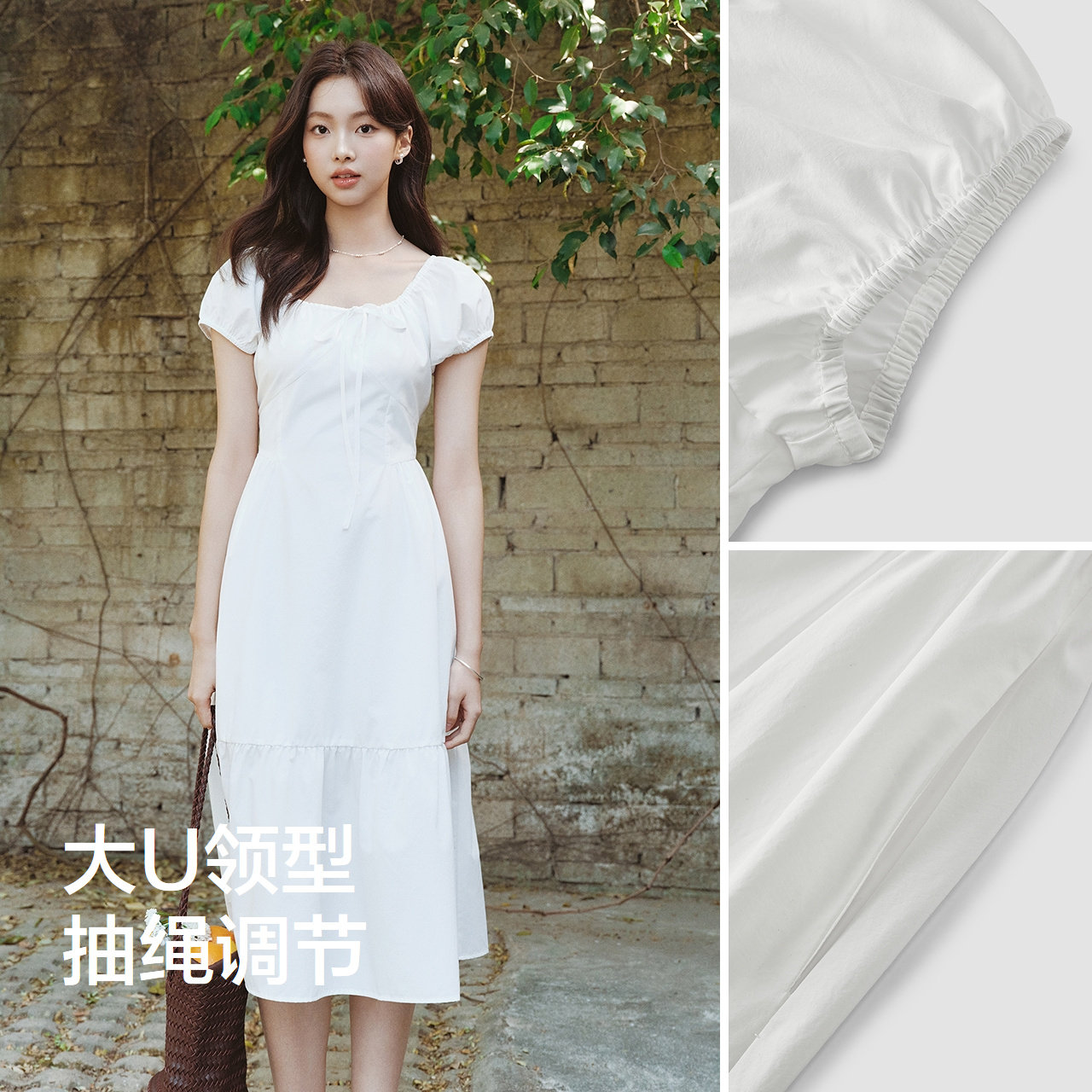 抽绳大U领凸显锁骨 遮肉贝壳袖 优雅初恋裙