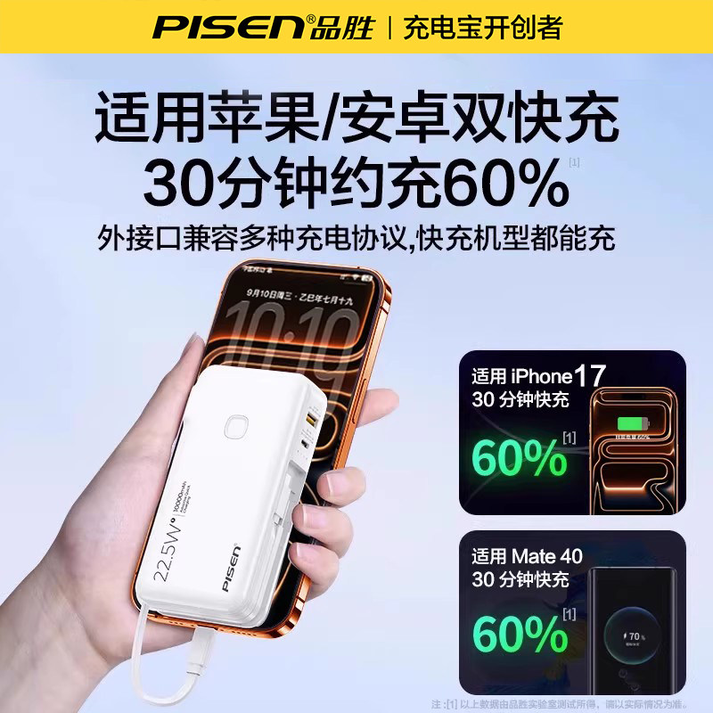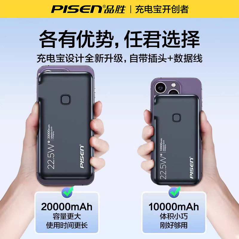 【3C认证充电宝】品胜自带插头20000毫安大容量10000充电器二合一电霸标识自带线适用苹果17小米移动电源