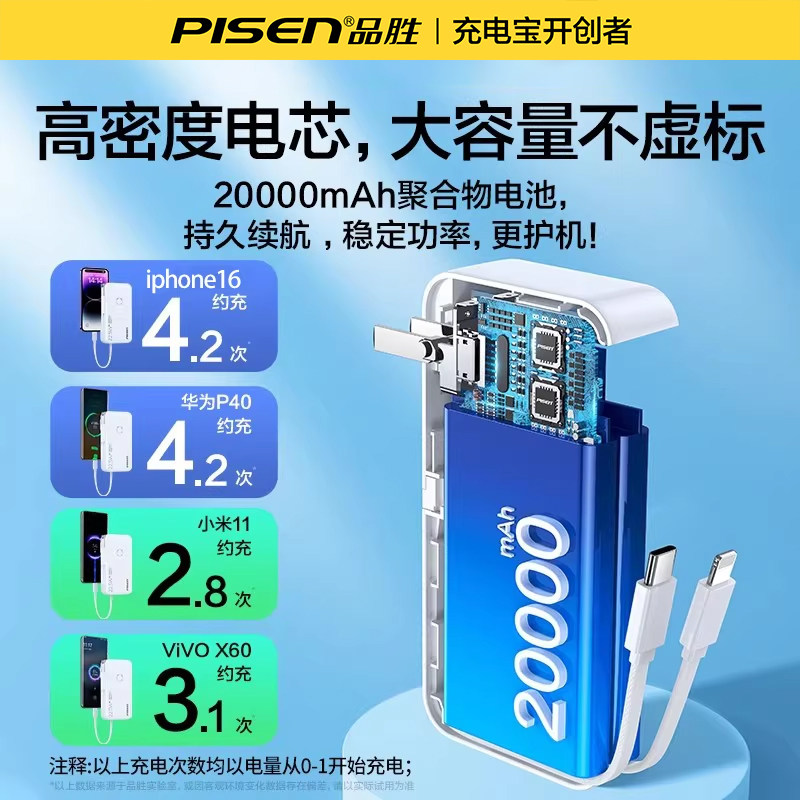 【充电宝3C认证】品胜20000毫安充电宝自带四线大容量超薄小巧便携政府补贴移动电源适用苹果17华为可上飞机