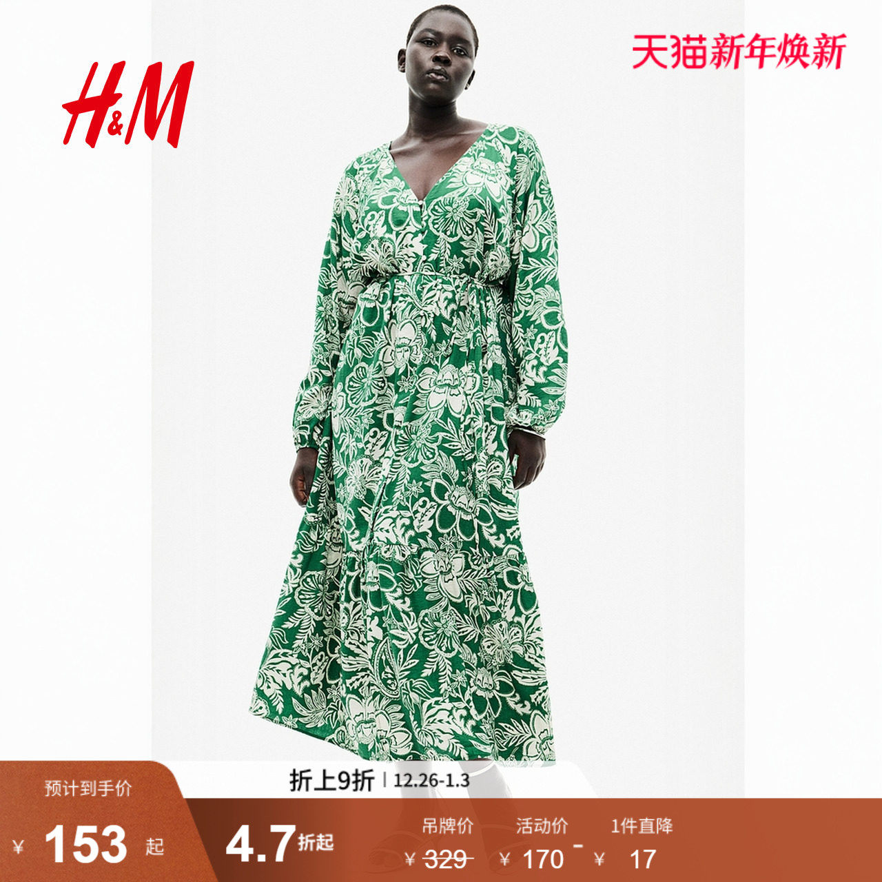 HM女装连衣裙春季宽松V领腰部系带绉织灯笼植物印花长裙1226566